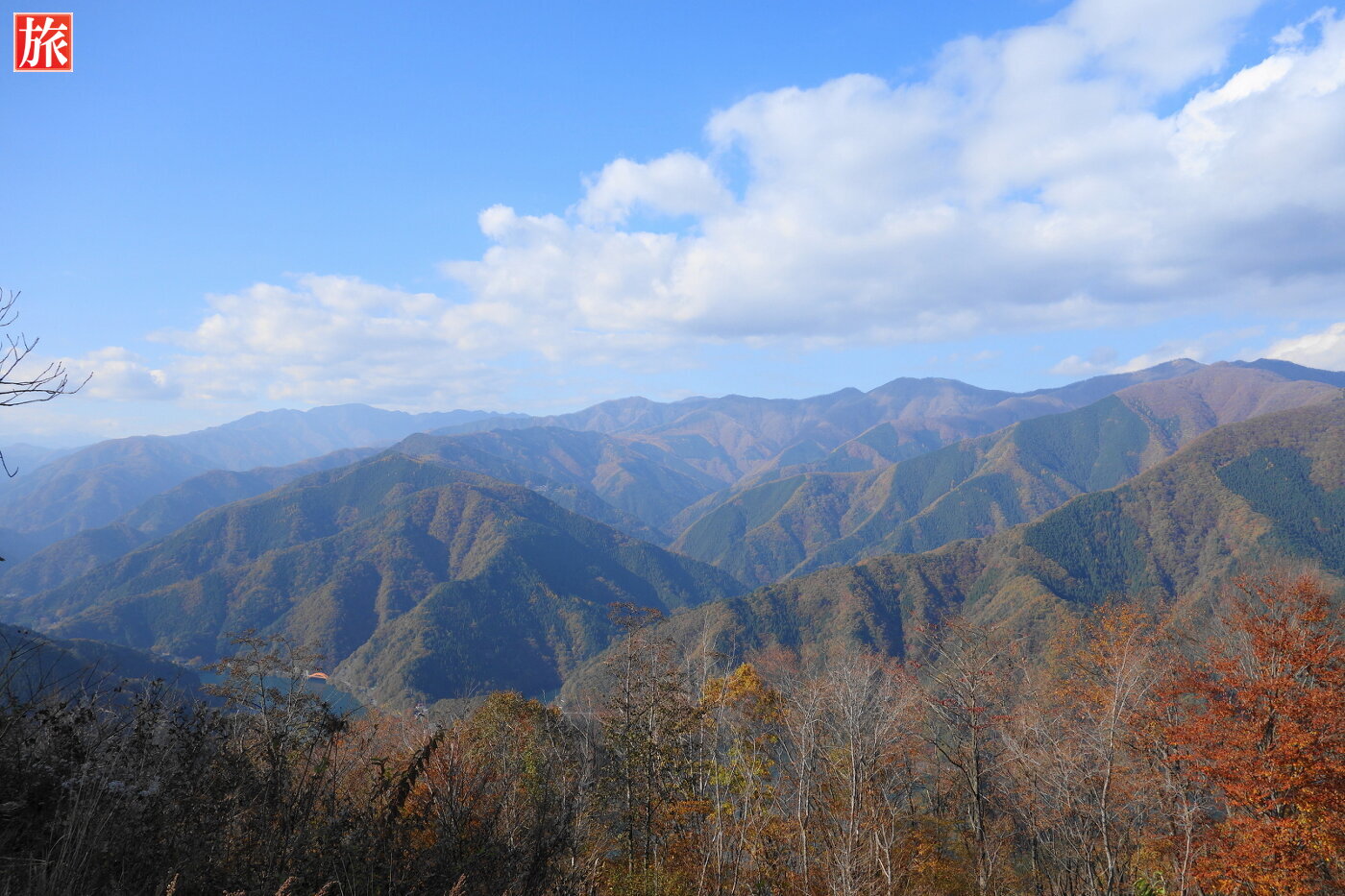 山梨と埼玉の県境にある雲取山(2017m)や鷹ノ巣山(1736.6m)・倉戸山(1169m)・六ツ石山(1478.9m)などの山々の見える景色です。オレンジ色の麦山橋。