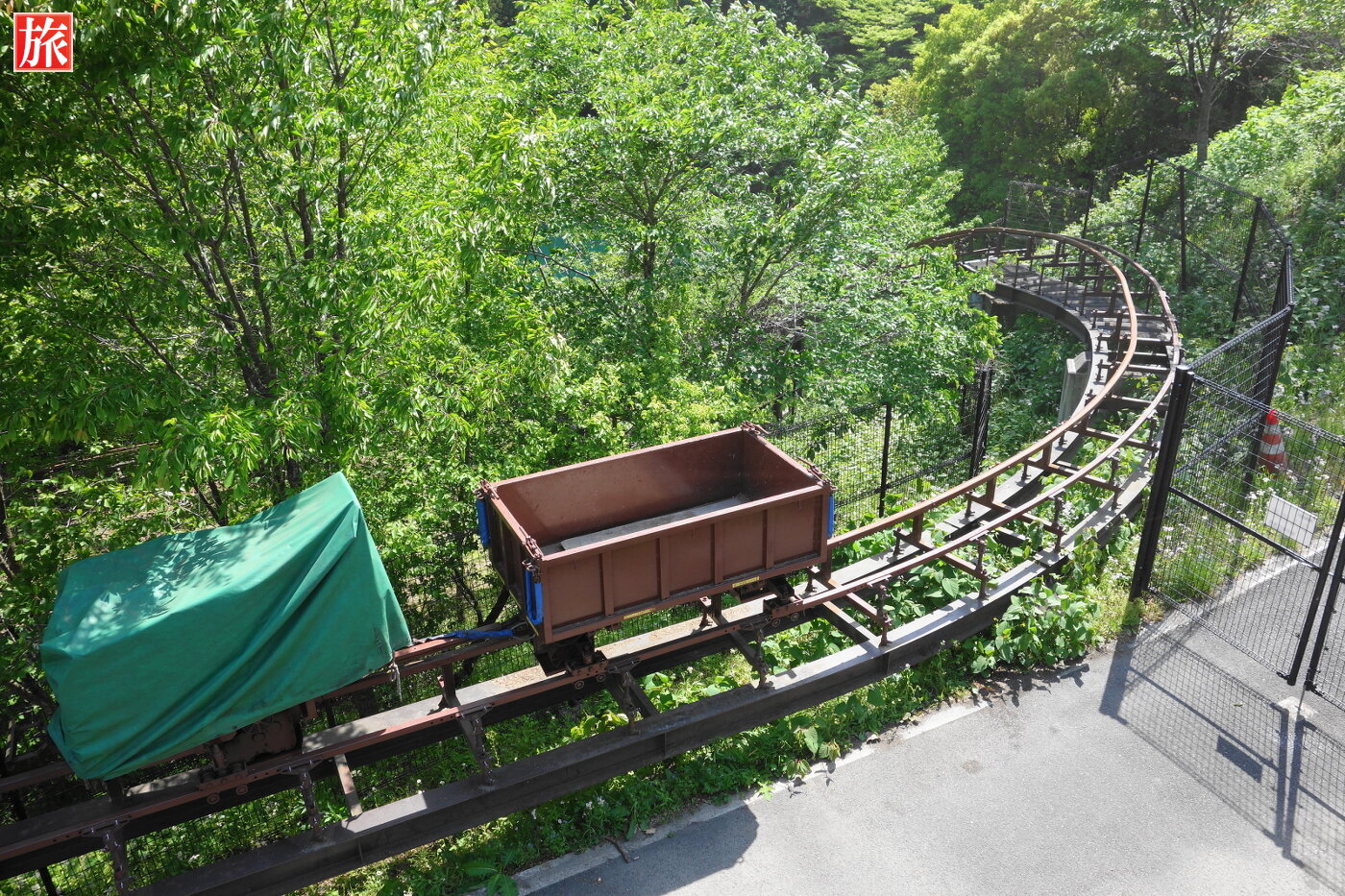 吸い込まれな萌黄色をした白丸湖。白丸発電所入り口。資材運搬用のトロッコ。