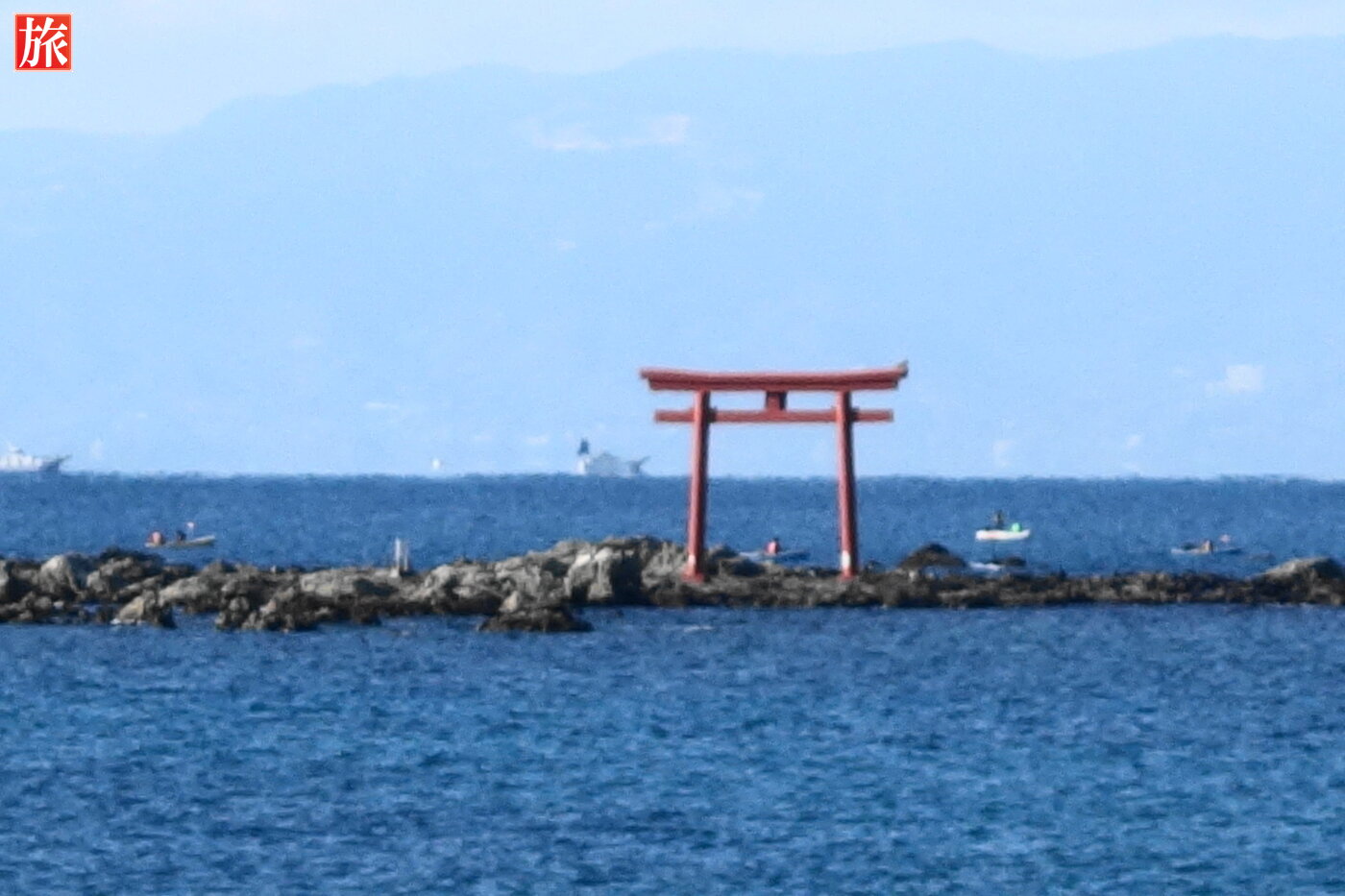 葉山灯台と名島の赤い鳥居。生憎富士山は見えませんでした。拝殿を斜め下から。みそぎ橋から拝殿方向を望む。