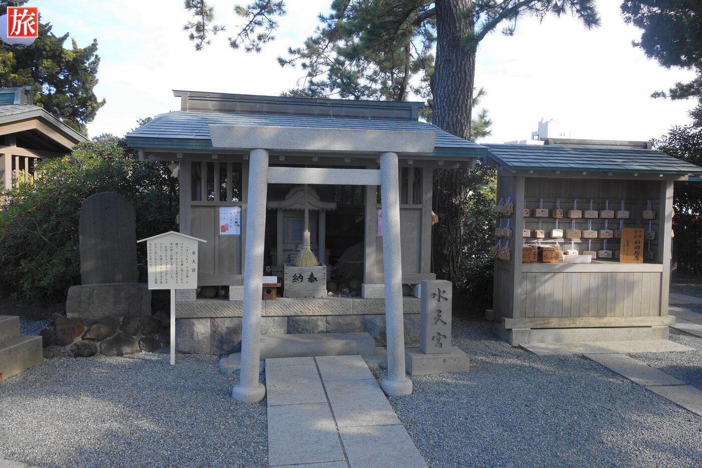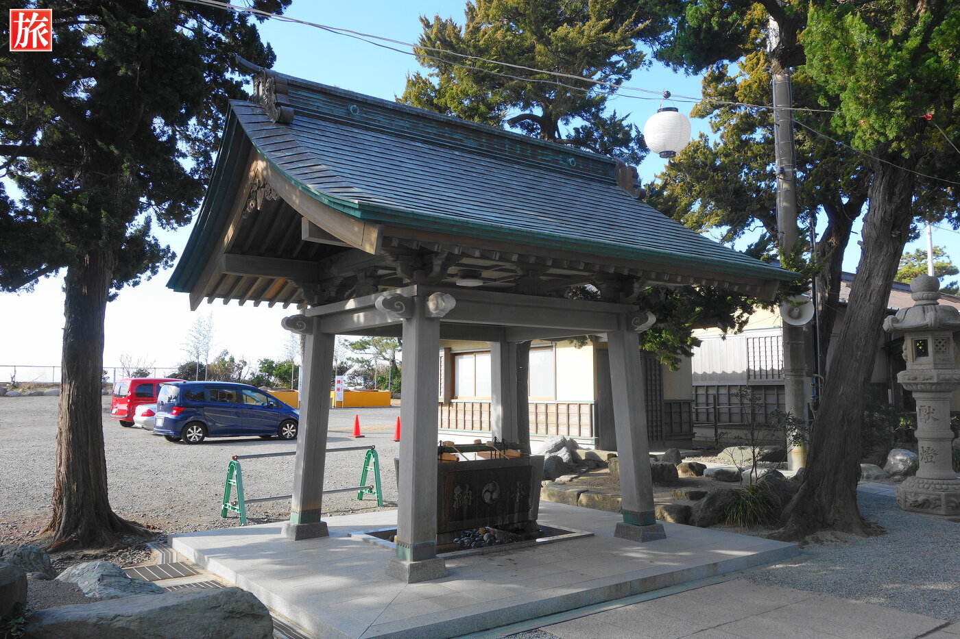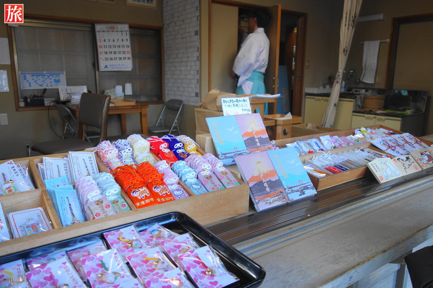 鯛のおみくじ。大海原に見立てた桶の中に、赤、金、黒の「鯛みくじ」が泳ぎ、専用の釣り竿で自らお好きな鯛を釣り上げます。本殿・拝殿。鎌倉時代に創建され、400年以上の歴史を誇り「葉山町の重要文化財」