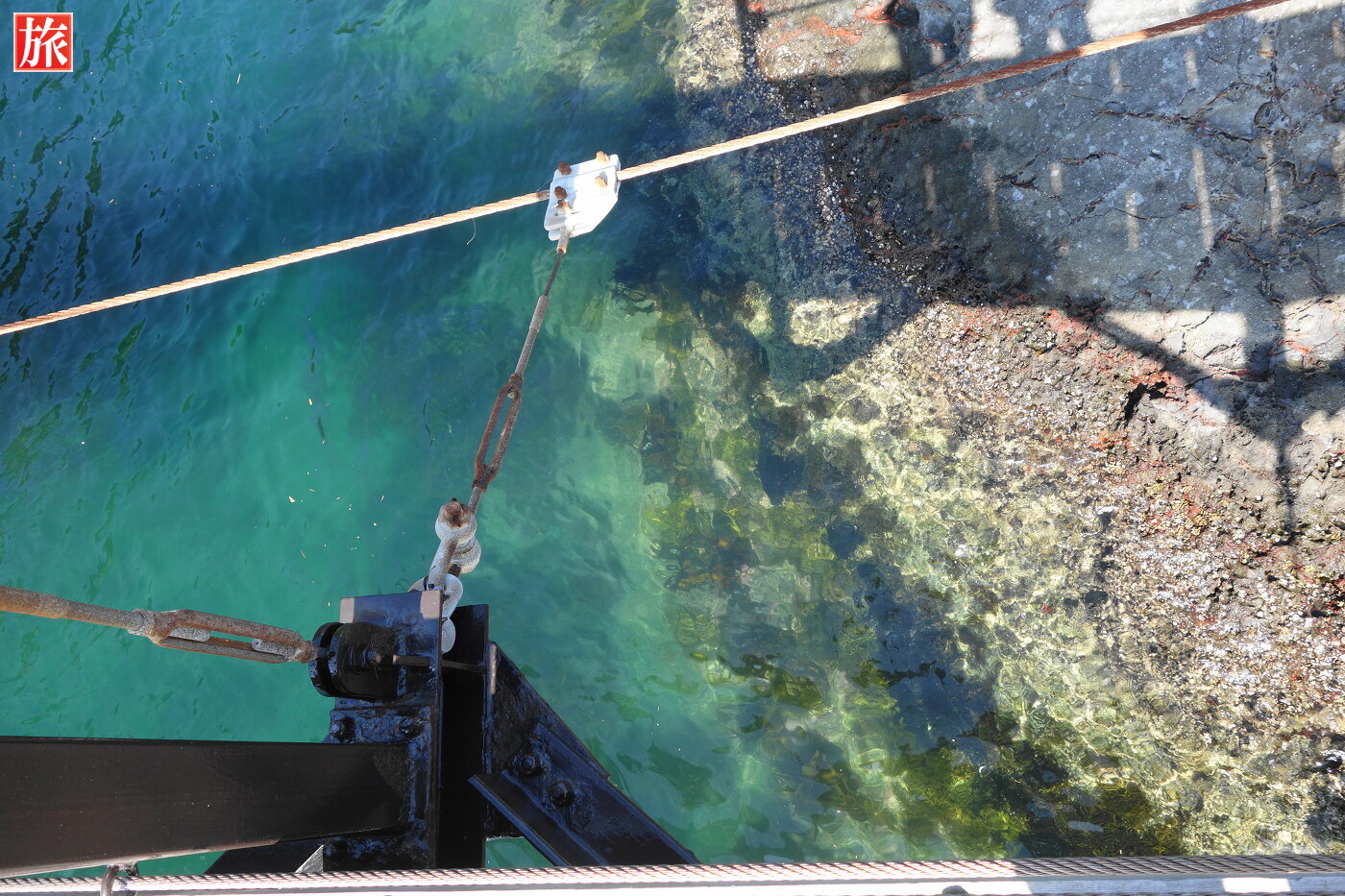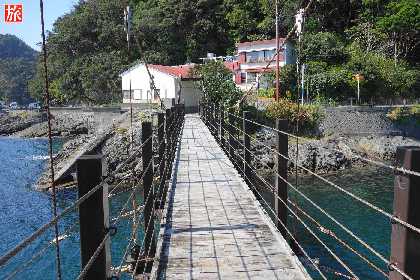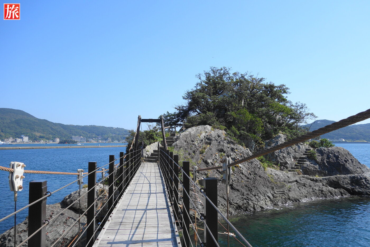 中ほど過ぎから振り返った様子。島側から見た吊り橋の全景。透明度の高い海。