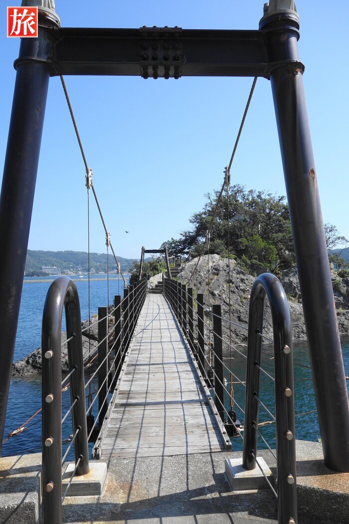 下田海中水族館の横にある小島。吊り橋が目に入ったので立ち寄ってみました。吊り橋は揺れることもなく頑丈にワイヤーで吊られていました。この島は、磯物の隠れたポイントとして知られています。島内のあちらこちらにお地蔵様が祀られていました。