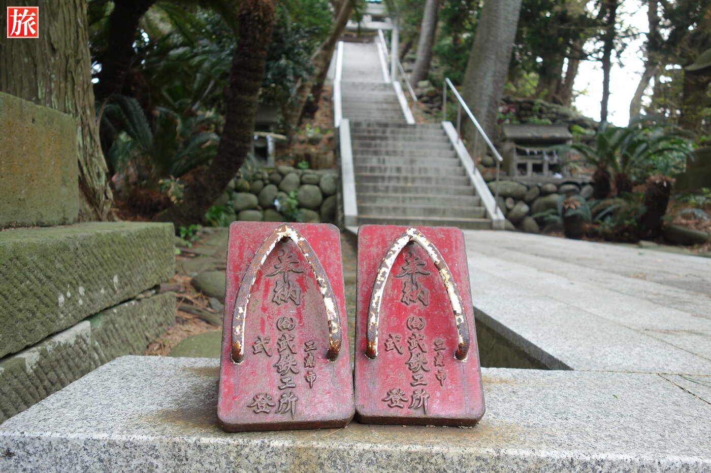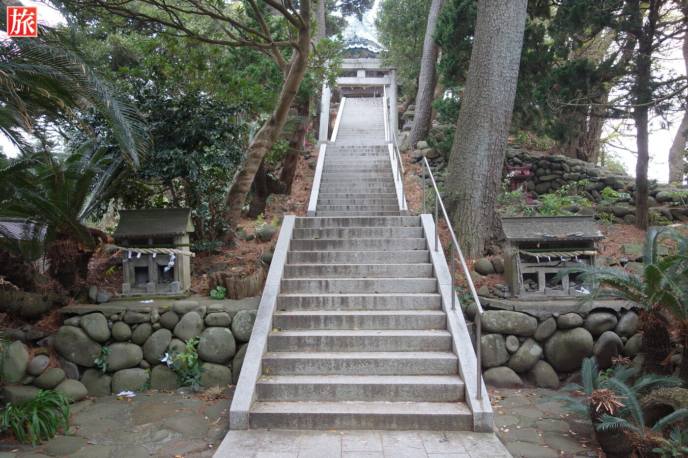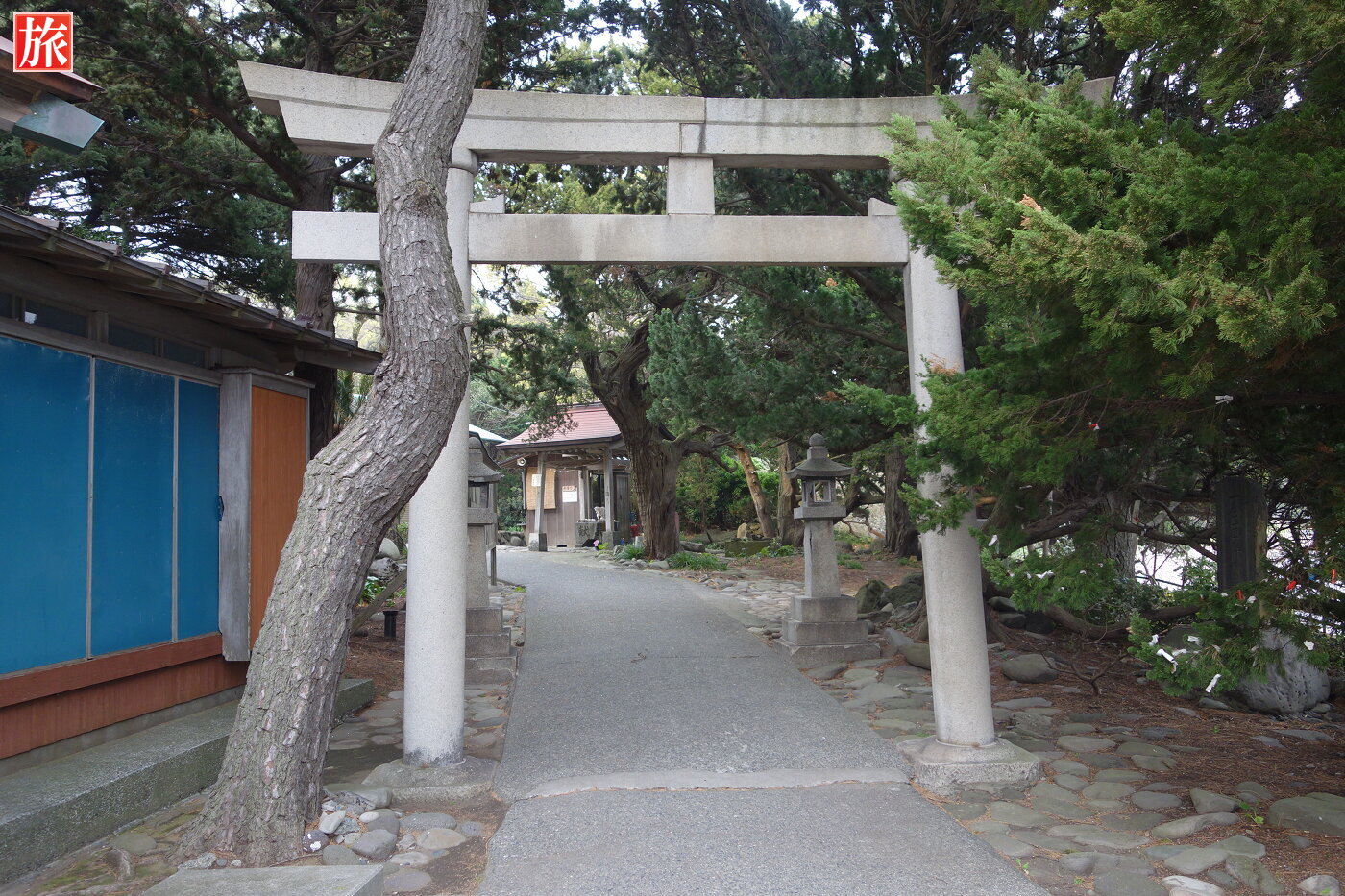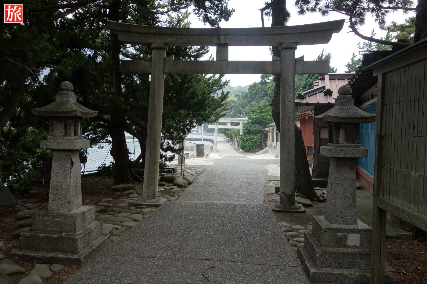 岬の海岸線、北側参道を進んでいきます。一つ目鳥居。二つ目の鳥居。振り返って見た様子。
