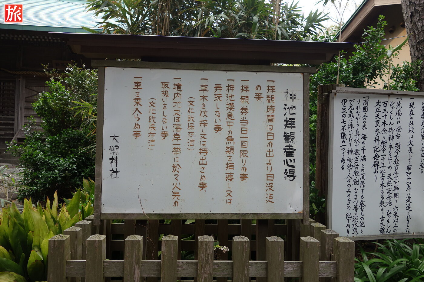 参拝がすみ次は神池に向かいます。神池拝観者の心得・大瀬神社の説明。こちらは無人でしたが神池拝観料(100円)を箱に納めます。伊豆七ふしぎの一つの看板。