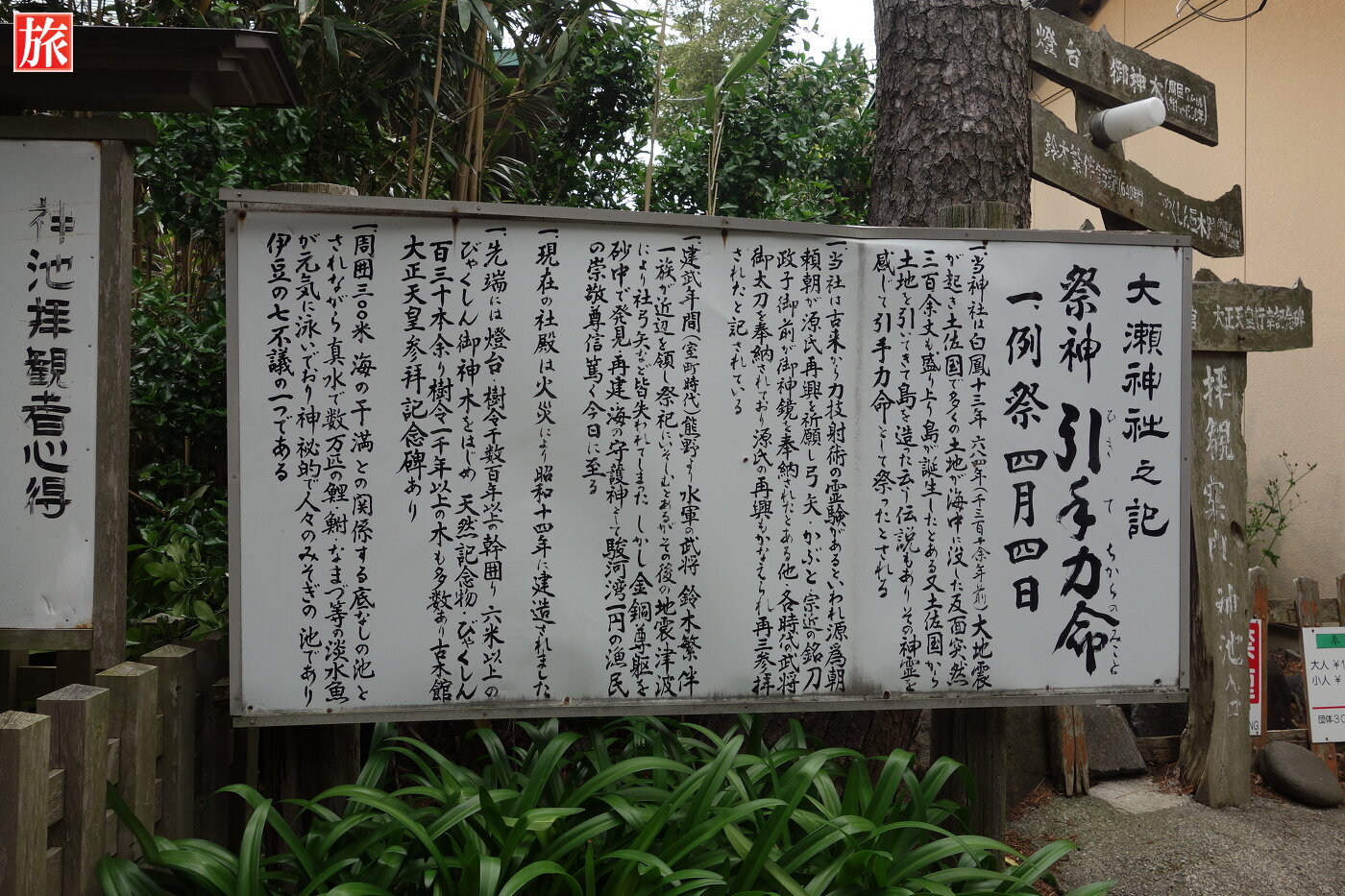 大瀬神池に着きました。大瀬神社本殿から2〜3分です。大瀬神池の説明。