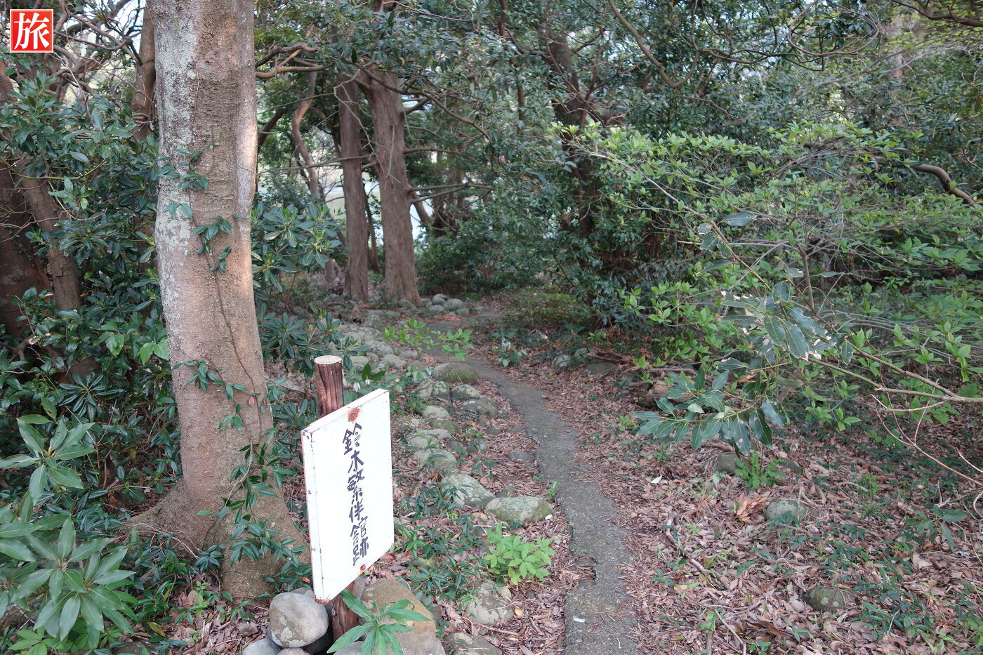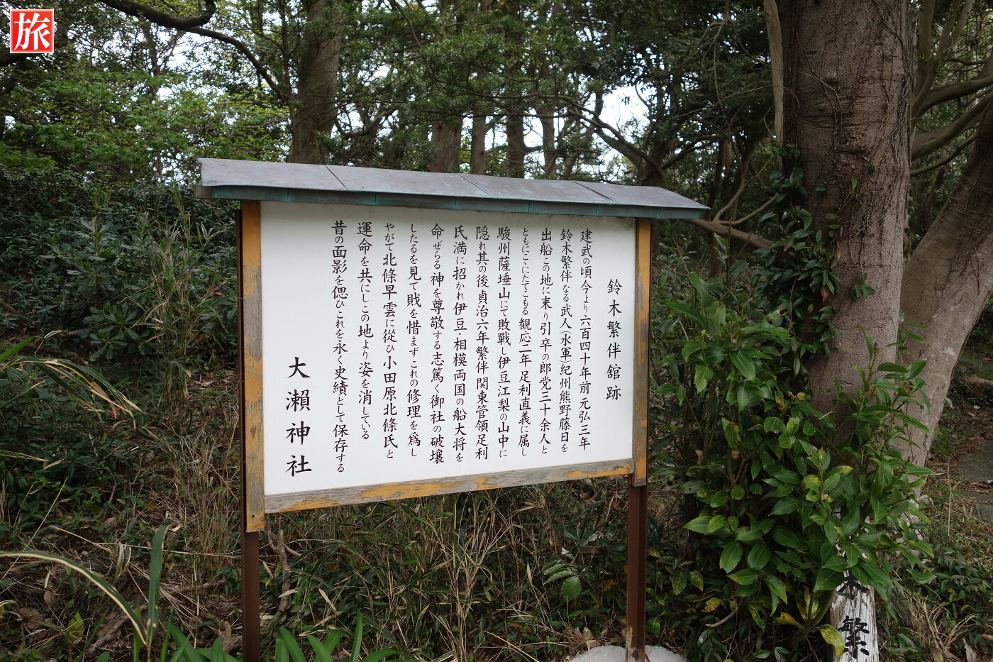 鈴木繁伴館跡:建武の頃、今より640年前、元弘三年鈴木繁伴なる武人(水軍)紀州熊野藤日を出船この地に来り、引率の郎党三十余人とともにここにたてこもる。観応二年足利直義に属し、駿河薩?山にて敗戦し、伊豆江梨の山中に隠れ、その後、貞治六年繁伴関東管領足利氏満に招かれ、伊豆・相模両国の船大将に命ぜられる。神を尊敬する志篤く、御社の破壌したるを見て財を惜しまずこれの修理を為しやがて北條早雲に従い小田原北条氏と運命をともにしこの地より姿を消している。昔の面影を偲びこれを永く史跡として保存する。-大瀬神社より