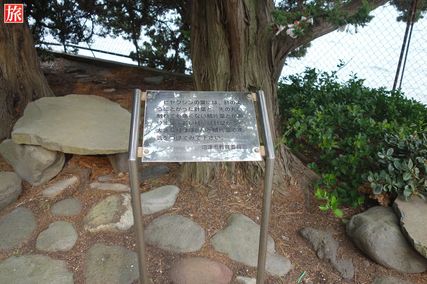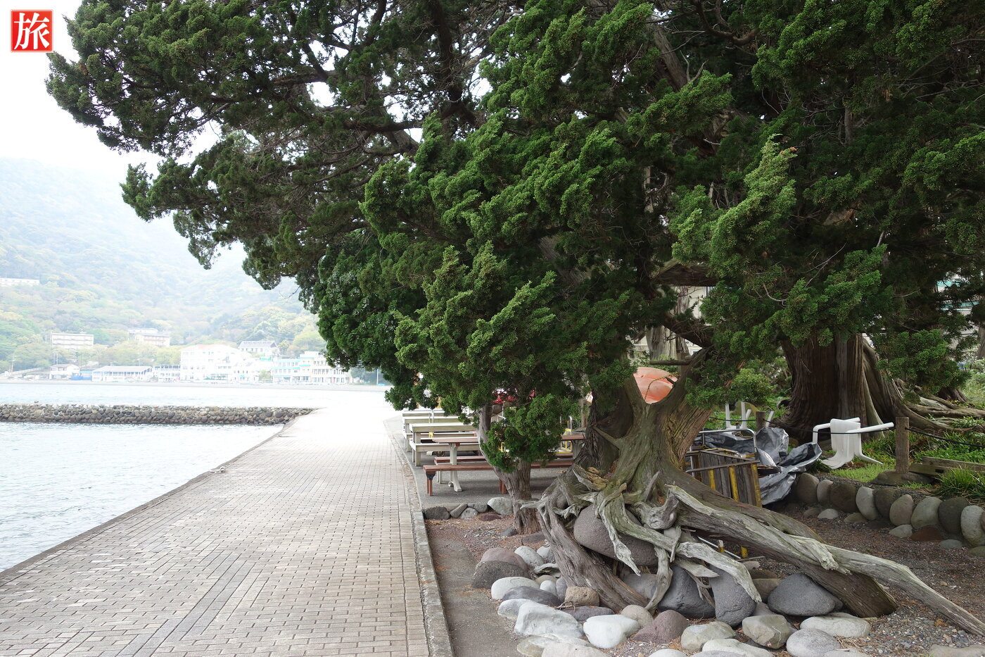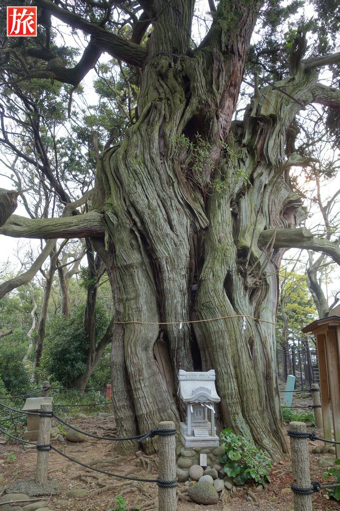 岬の先端。灯台の近くにある御神木の夫婦ビャクシンです。周囲7メートル、推定樹齢1500年以上の岬随一の古木。伊豆大瀬埼灯台。