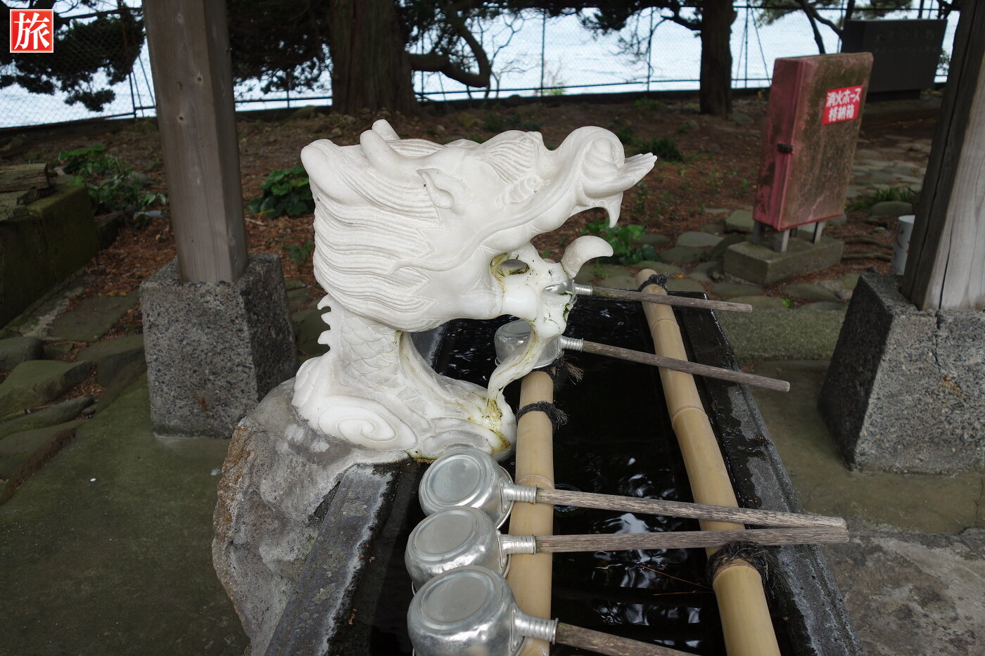 手水舎。白龍の口から水が出ています。本殿入口建つ鳥居。