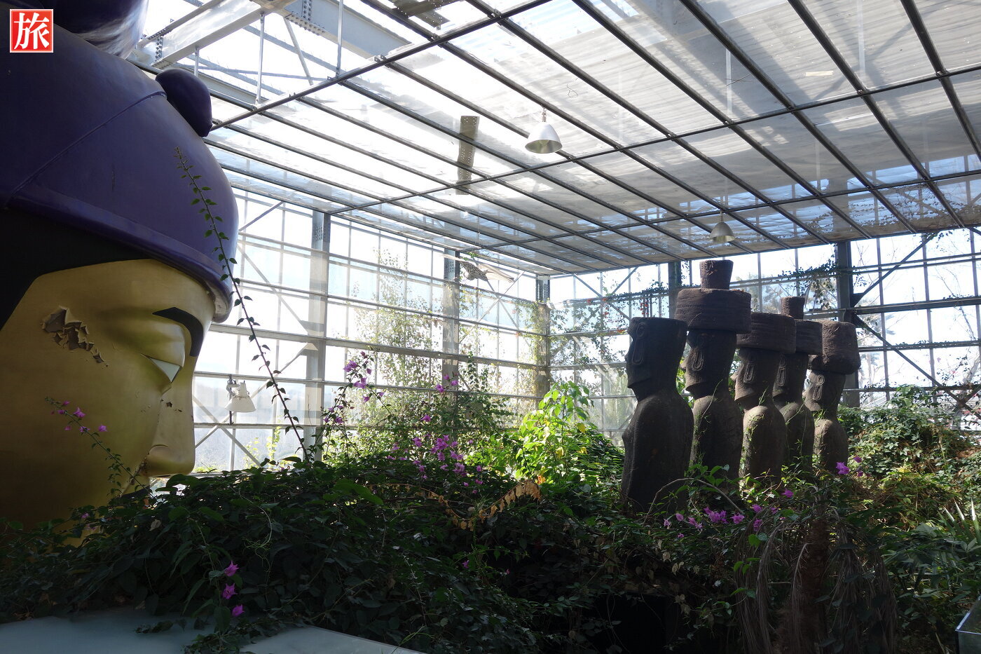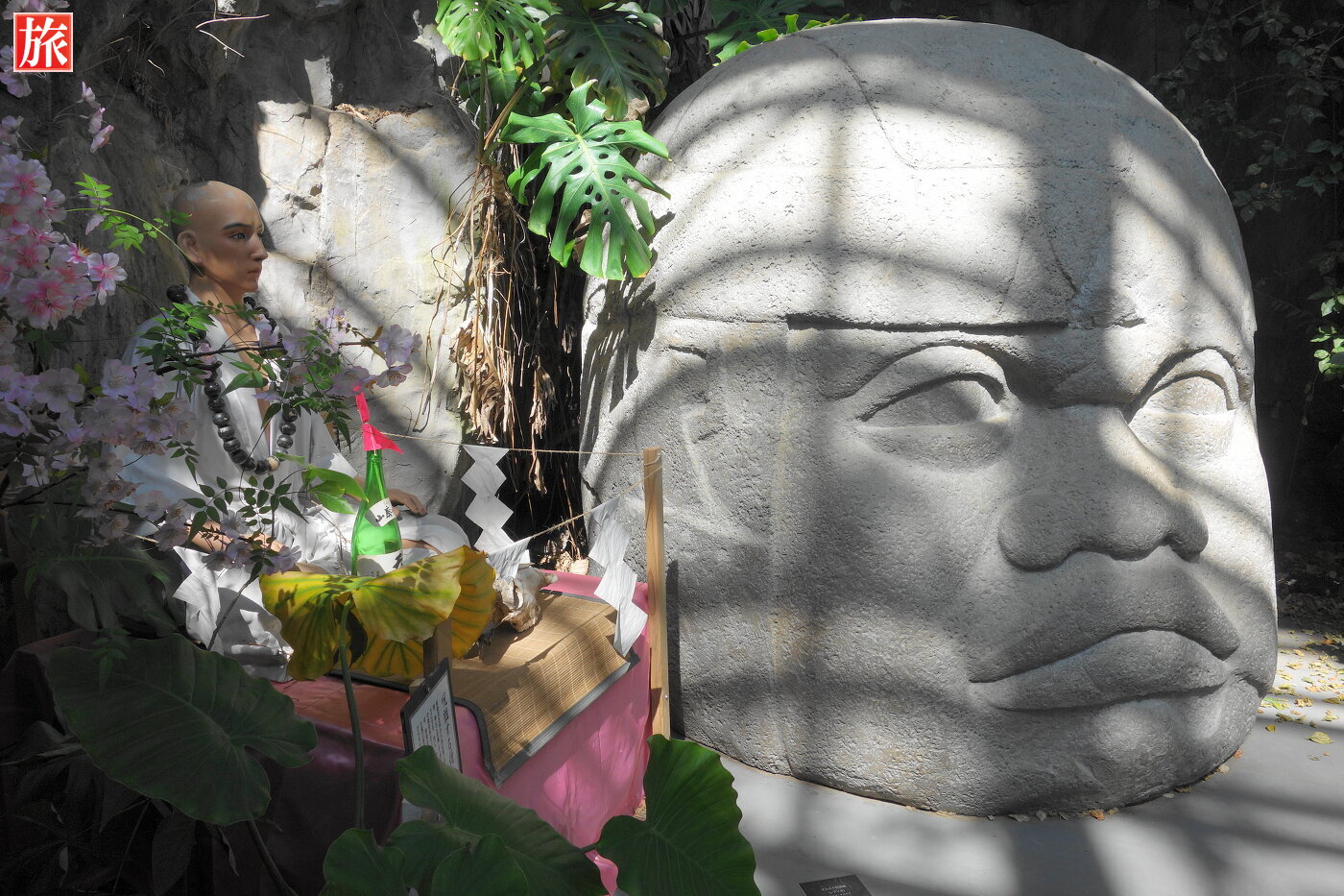 大仏堂入口。閉園した植物園の名残でしょうか?空調の利いたガラスの室内に植物が茂っています。オルメカ文明の巨石人頭像。
