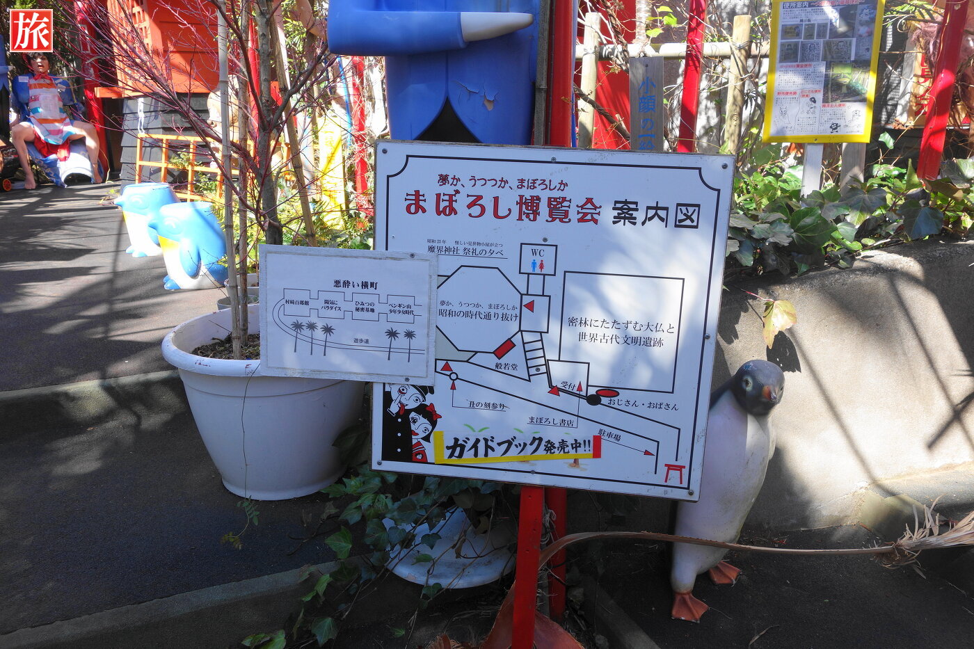 まぼろし博覧会の案内図。巨大の恐竜オブジェ。昭和の時代通り抜け「夢か・うつつか・まぼろしか」展示室の入口。