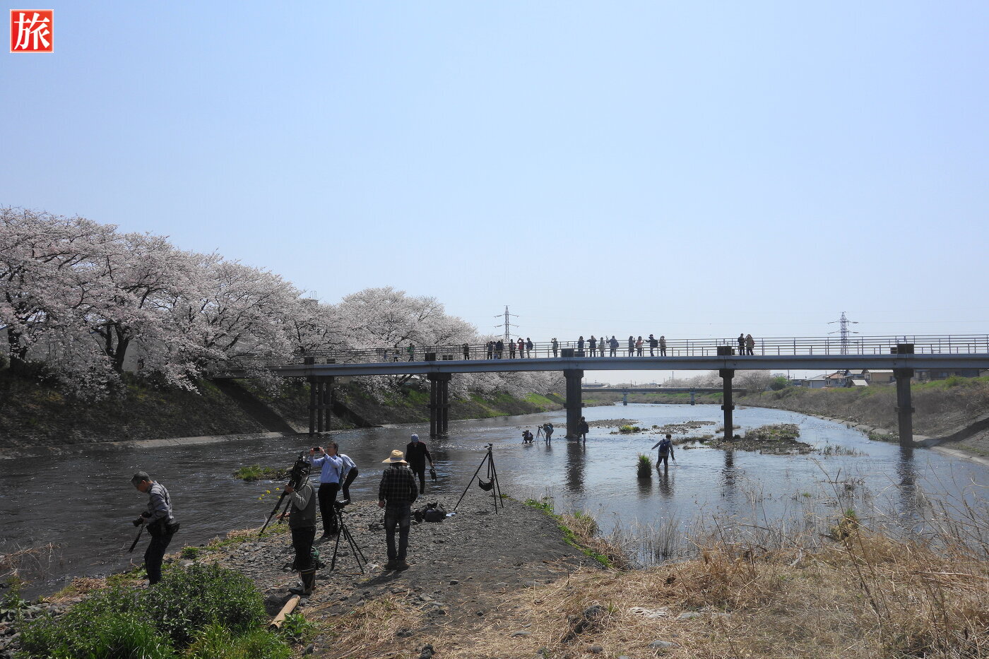 潤井川に掛かる橋の上から眺めた風景。河原から橋方向・・橋の上では多くの人が撮影をしています。