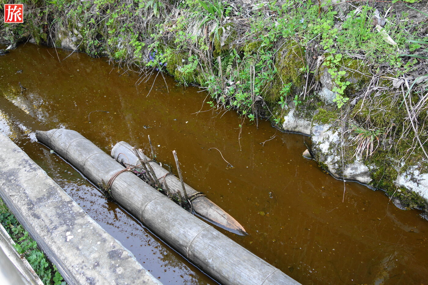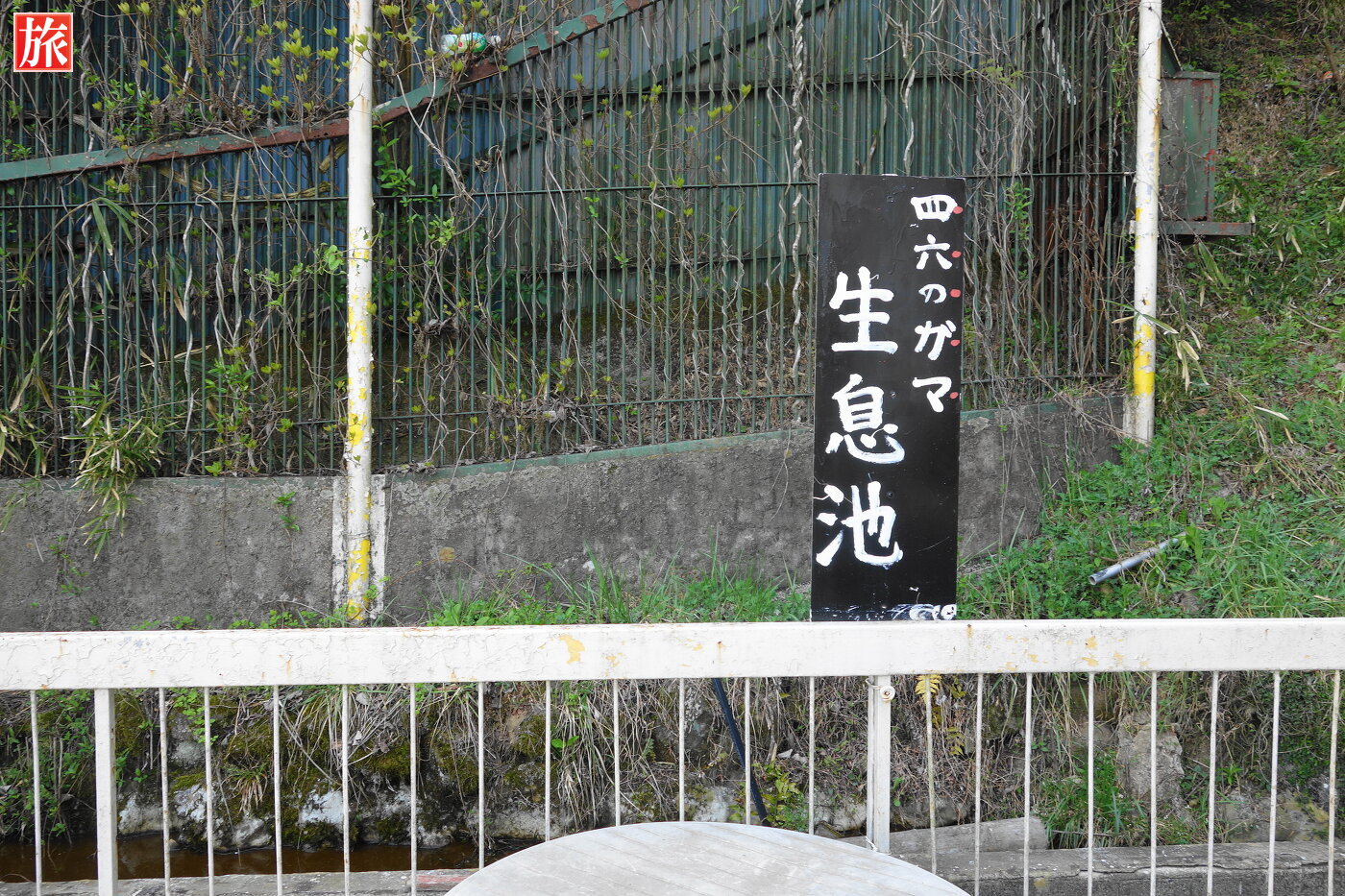 青いペンキが剥げ水が落ちていない「神秘ガマの滝」。ガマの滝の先には四六のガマ・生息地。生息地は泥水。にぎり石(山中より出土)。