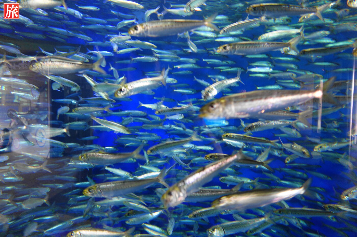 水族館の案内図。鰯が泳ぐ水槽。キラキラして綺麗!記念撮影のフォトポイント。