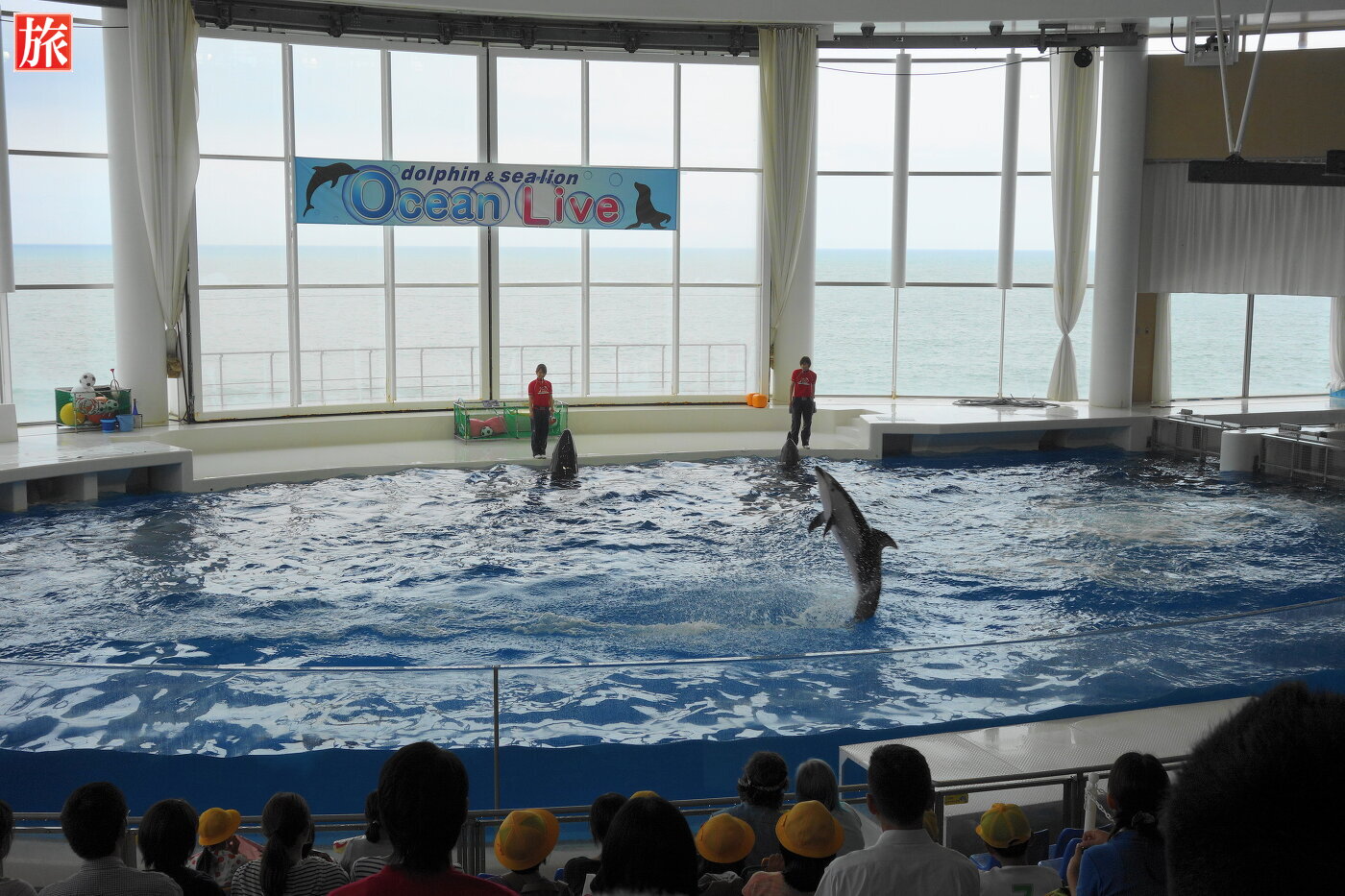 イルカが空中を乱舞するオーシャンライブ、水槽に潜ったダイバーが水中カメラで魚の表情を映し出してくれるアクアウォッチングなど、ショープログラムも充実。一日たっぷり楽しめる。アクアホールの水槽内を優雅に泳ぐイルカも見られる。