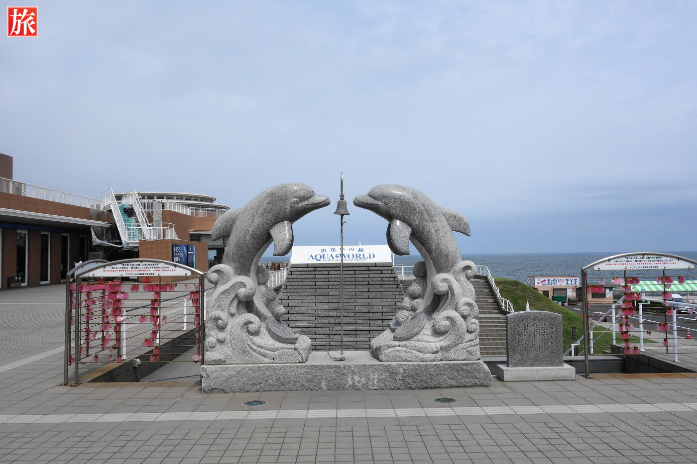 専用駐車場からアクアワールドへ向かいます。駐車場の様子。イルカの石造が歓迎してくれました。中央には鐘があります。