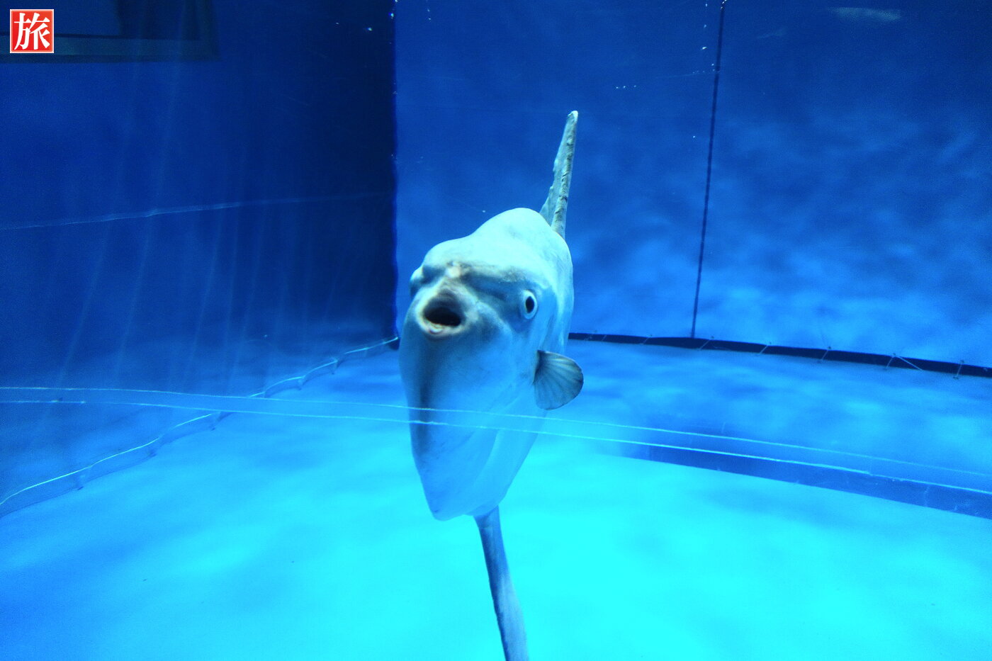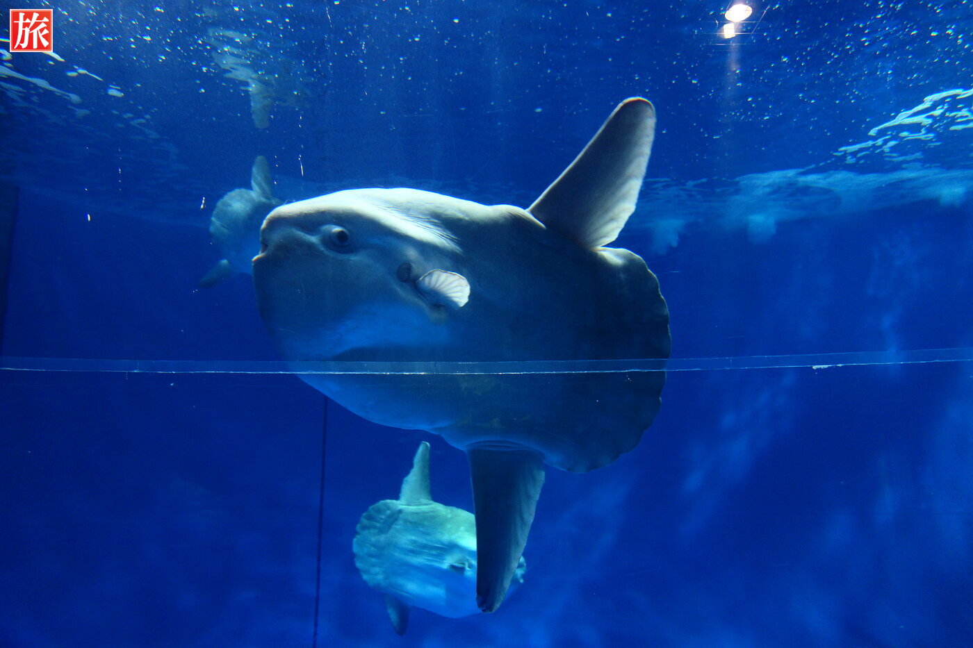日本一の大きさを誇るマンボウ専用水槽(270トン)。 口をぽっかり空けてゆっくり泳ぐマンボウ。