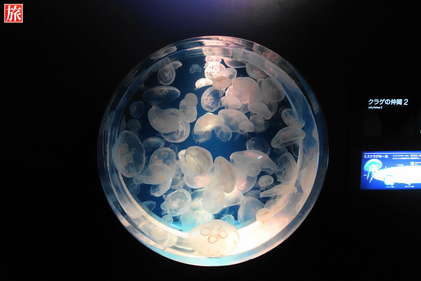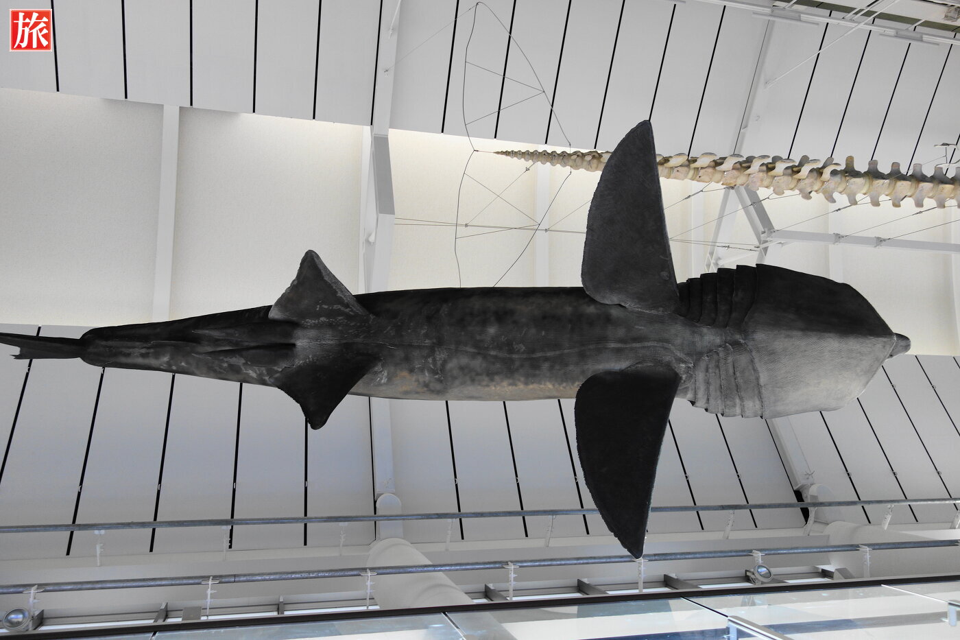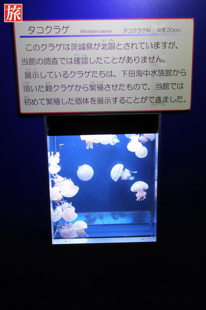 タコクラゲ。ミズクラゲ。企画展前の通路天井にウバザメの剥製が吊り下げられています。
