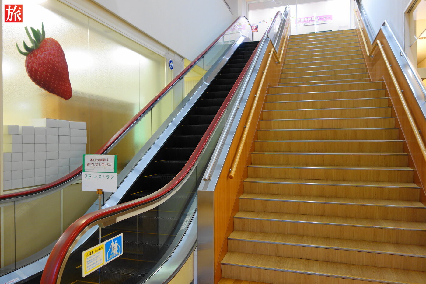 2Fに登る階段・・訪れた時間が閉店まぎわだったため、2Fのレストランなどは営業終了していました。