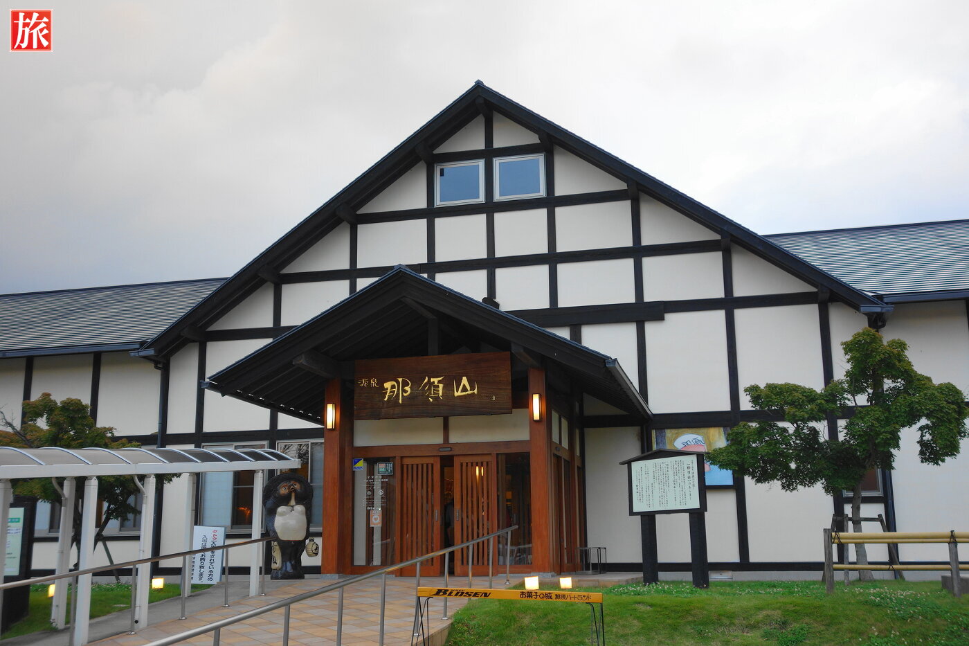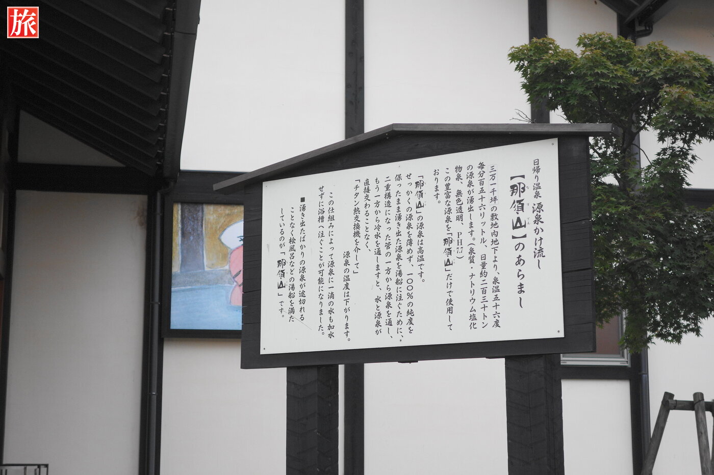 お菓子の城の裏にある日帰り温泉 「源泉那須山」。那須山のあらましが書かれた説明板。