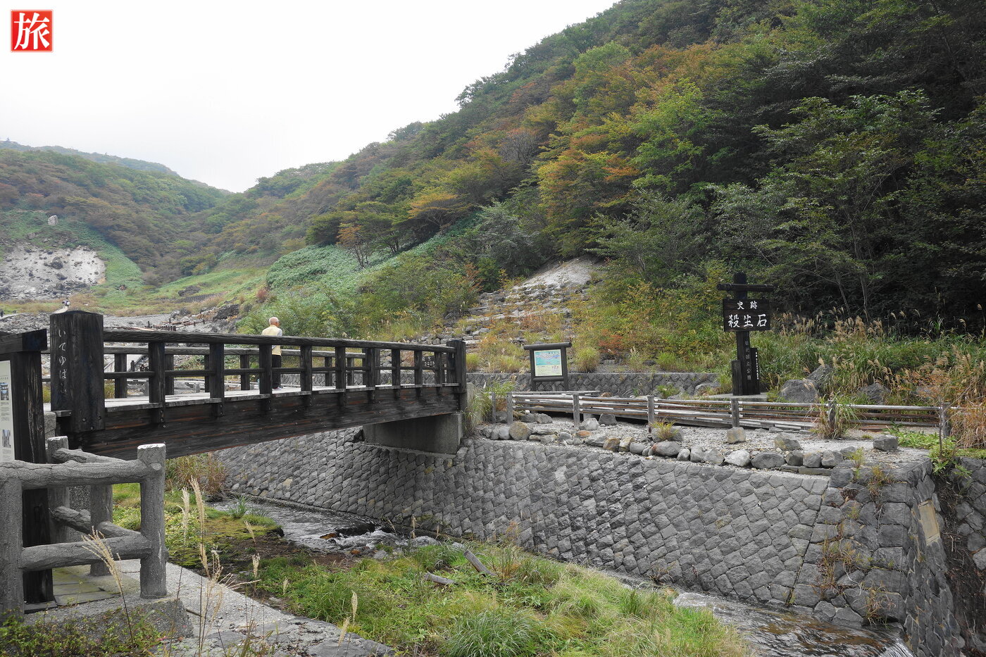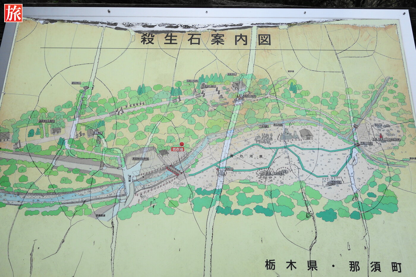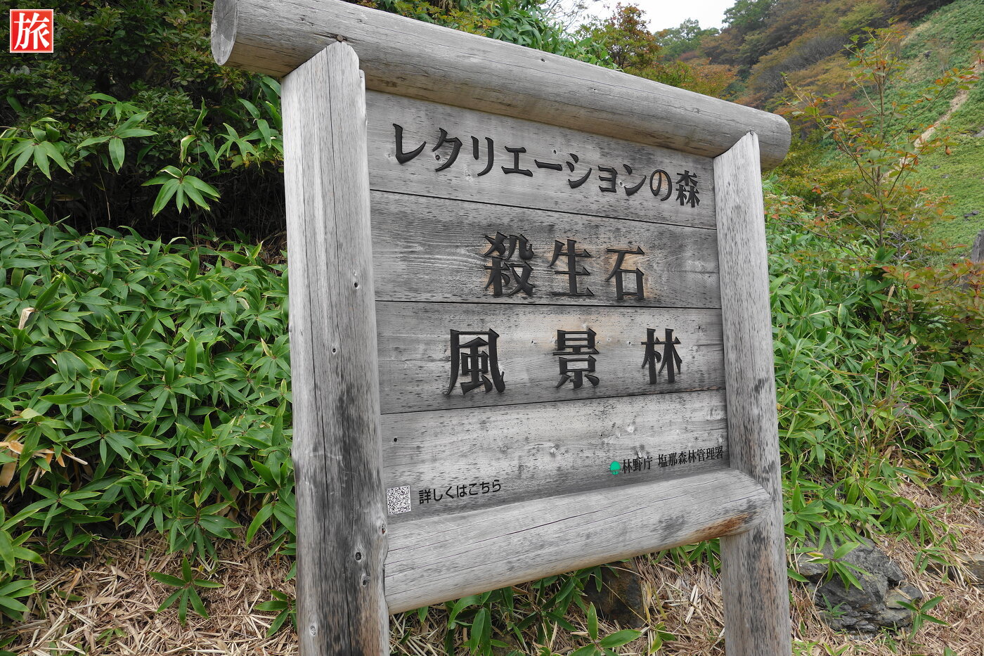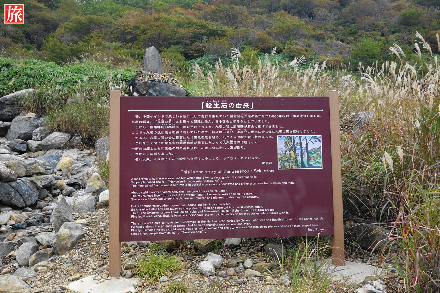 この地は松尾芭蕉が訪れた事でも有名で、「昔中国や印度で美しい女性に化けて世を乱し悪行を重ねていた白面金毛九尾(玉藻前)は死んでも人に危害を加える巨大な毒石に変化し、近づく人間や動物等の命を奪った」と伝わるが残る九尾の狐伝説の場所です。