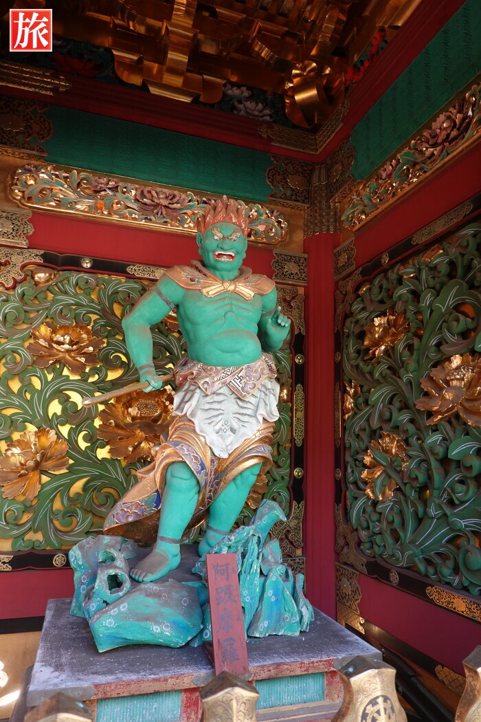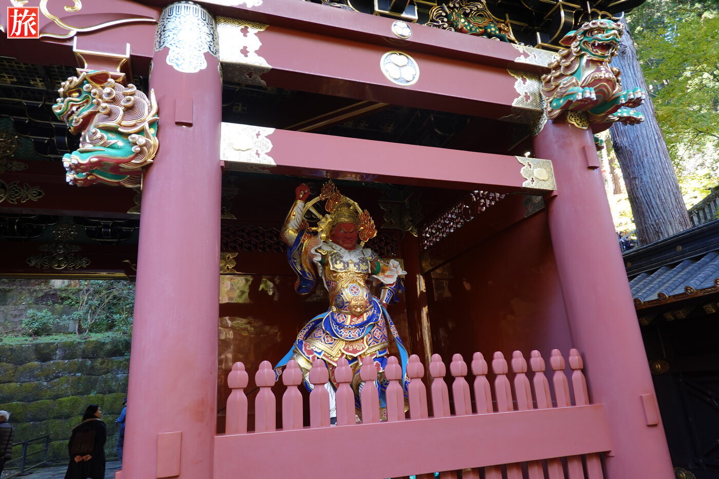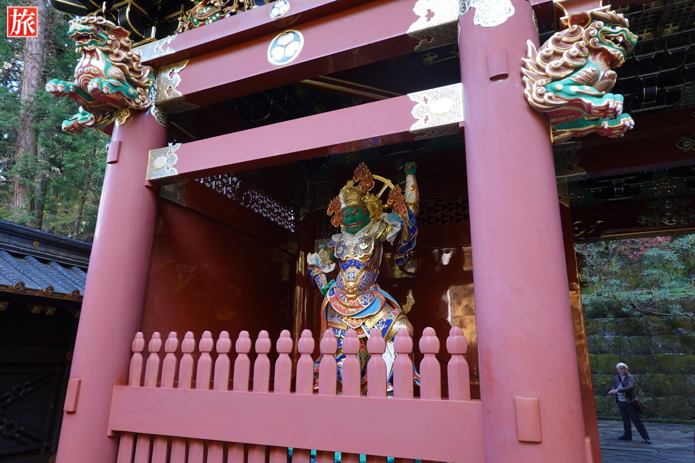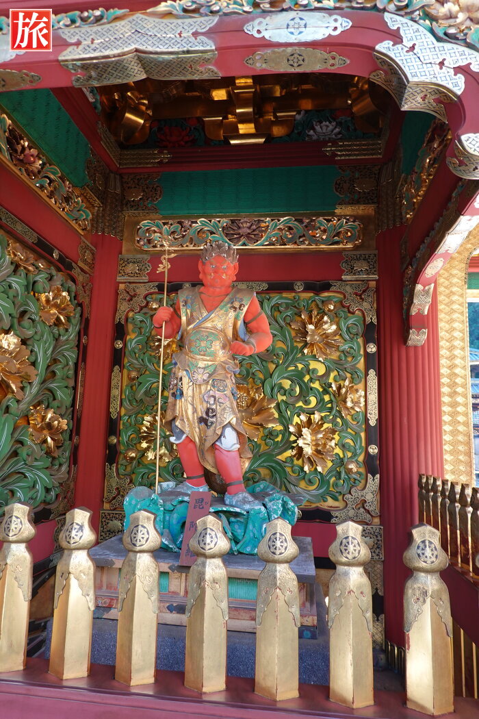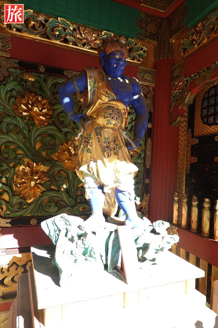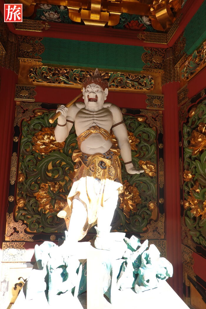 夜叉門。4体の夜叉(阿跋摩羅(あばつまら)、毘陀羅(びだら)、烏摩勒伽(うまろきゃ)、犍陀羅(けんだら)) が安置されています。夜叉門の先には国宝の拝殿、相の間、本殿があります。