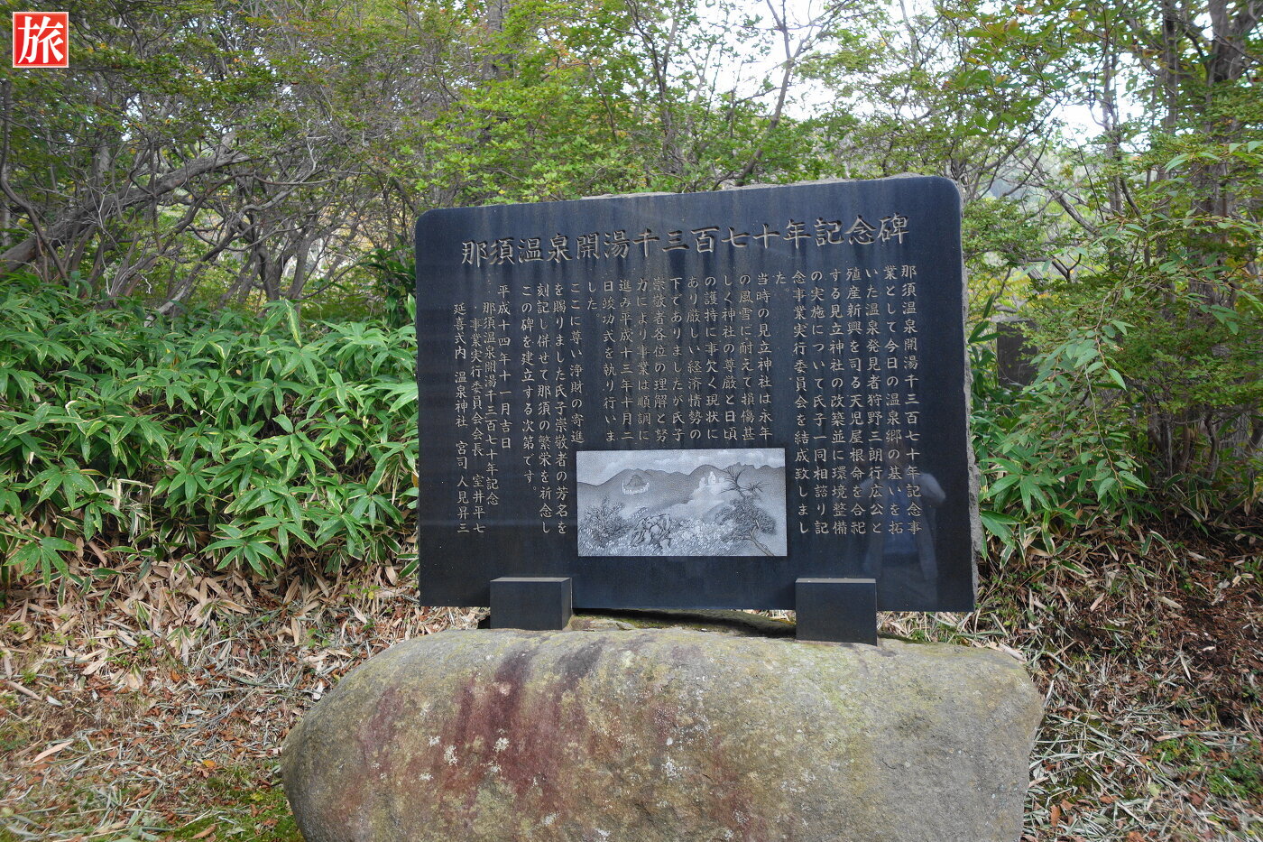 二の鳥居の右手には見立神社が鎮座。祭神は那須温泉開祖・狩野三郎行広と天児屋根命。狩野三郎行広公は温泉を発見した功により合祀されたそうです。見立神社の右手に建つ那須温泉開湯1370年記念碑。