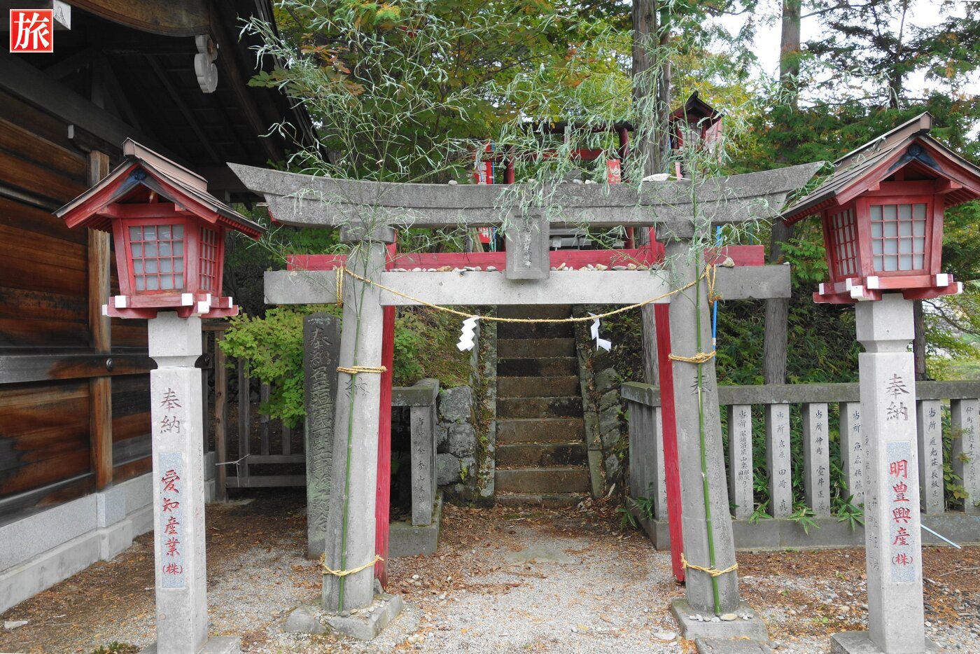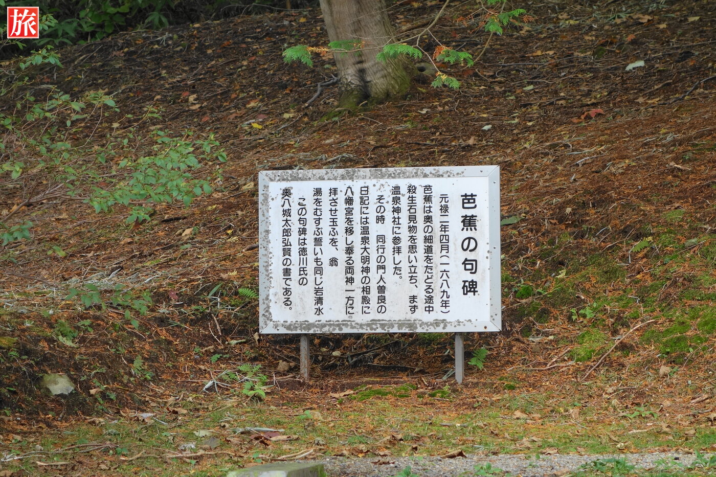 境内社 摂社、琴平神社・神明宮・山神社の4社。江戸元禄時代 奥の細道の途上、ここと殺生石を訪れた松尾芭蕉が残した句碑。「湯をむすぶ誓もおなじ石清水」。芭蕉句碑の説明。三の鳥居方向を振りかえった様子。