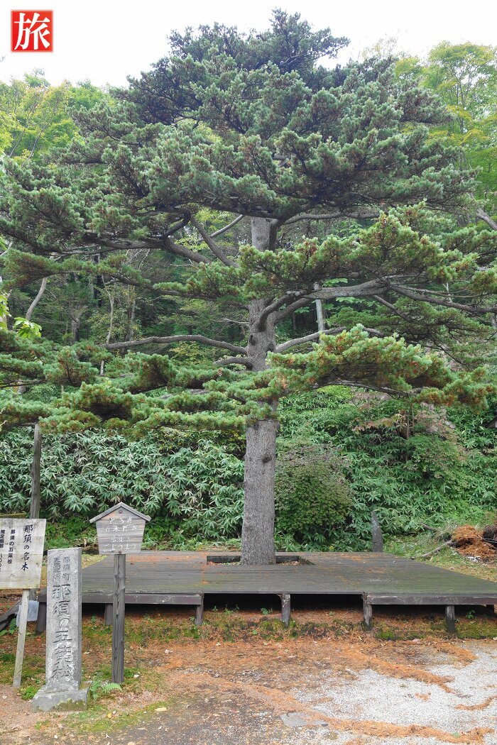 那須余市宗隆(なすのよいちむねたか)が奉献したとされる三の鳥居。振り返って見た様子。三の鳥居の右手にある推定樹齢800年といわれる、ミズナラの御神木「生きる」。活力、蘇勢力、生命力等のパワーが授けられる巨木として崇められているそうです。