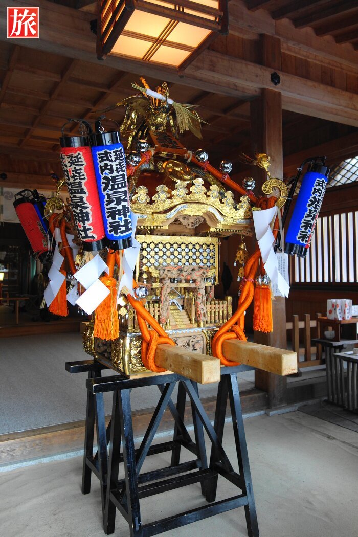 境内社殿。扁額「延喜式内 温泉神社」。拝殿内にあった神輿。温泉神社本殿内の様子。