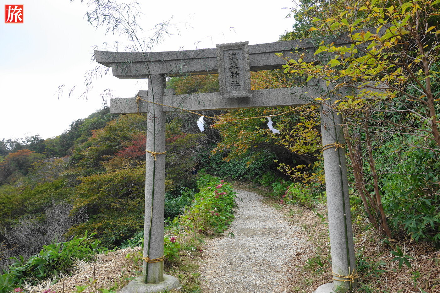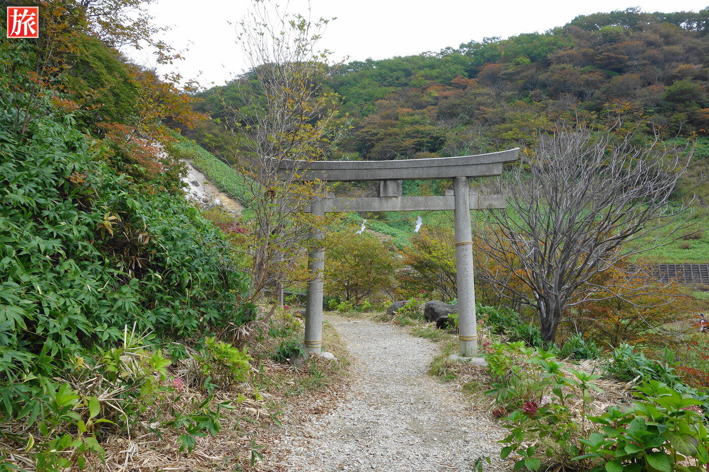 九尾稲荷神社脇から殺生石へ向かいます。殺生石と隣接して遊歩道が整備。温泉神社 この鳥居を潜ると殺生石へ・・