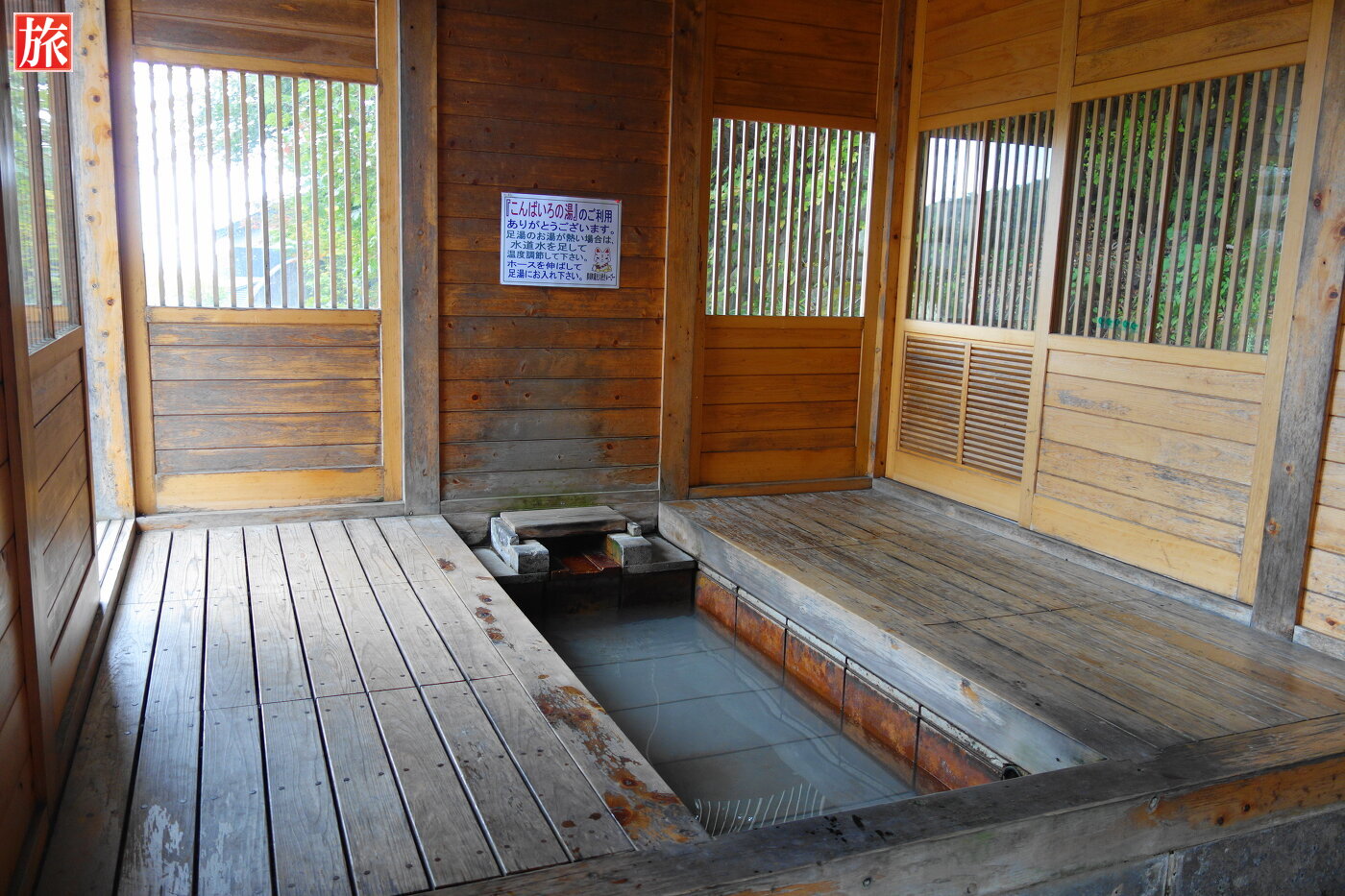 那須温泉神社前にある那須湯元から引いた足湯「こんばいろの湯」無料。参道入口に建つ一の鳥居。扁額(竹下登元首相が書いたとあります)。