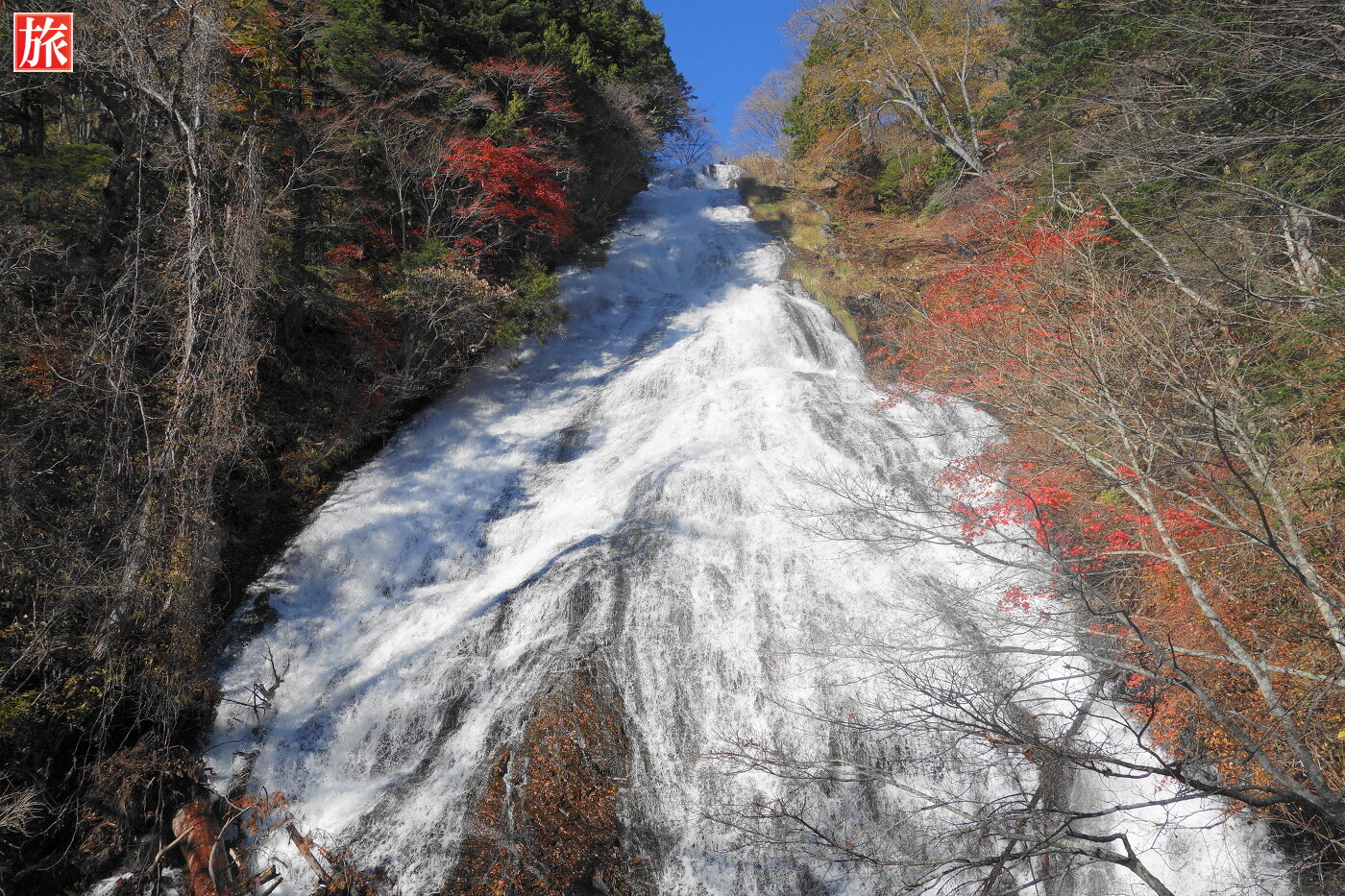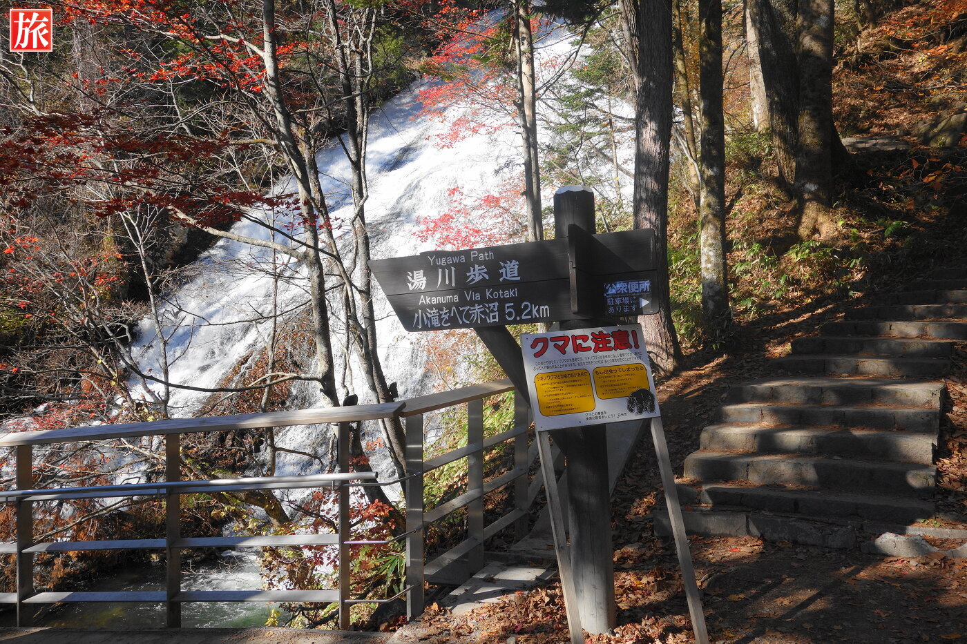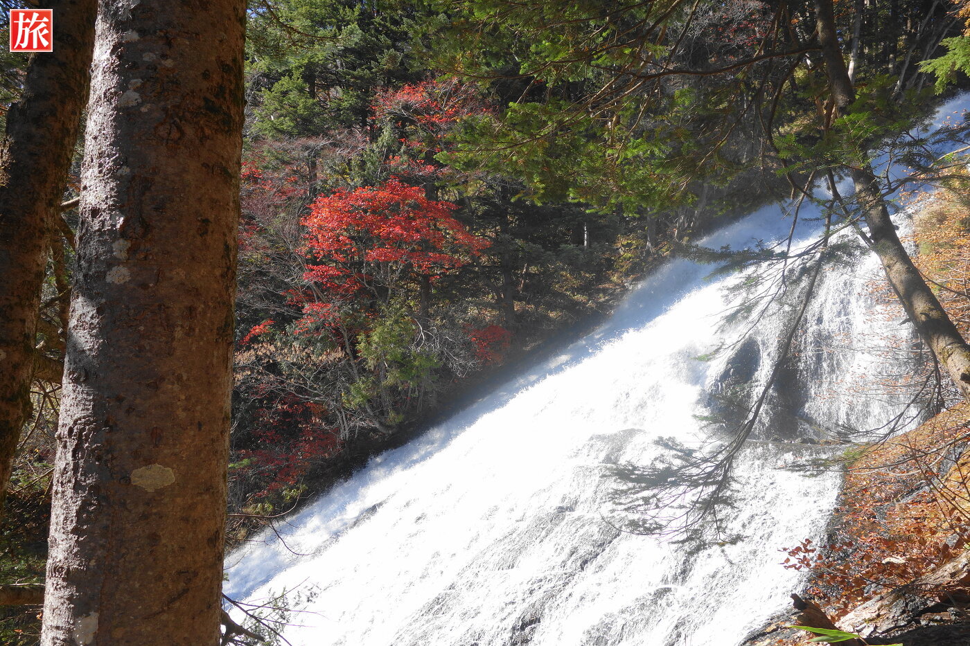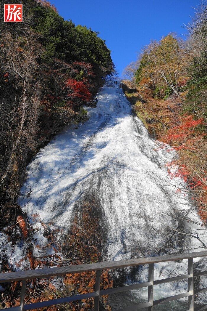 湯ノ湖まで遊歩道が階段で整備され、滝壺・側面・落ち口の三面から滝の姿望めます。