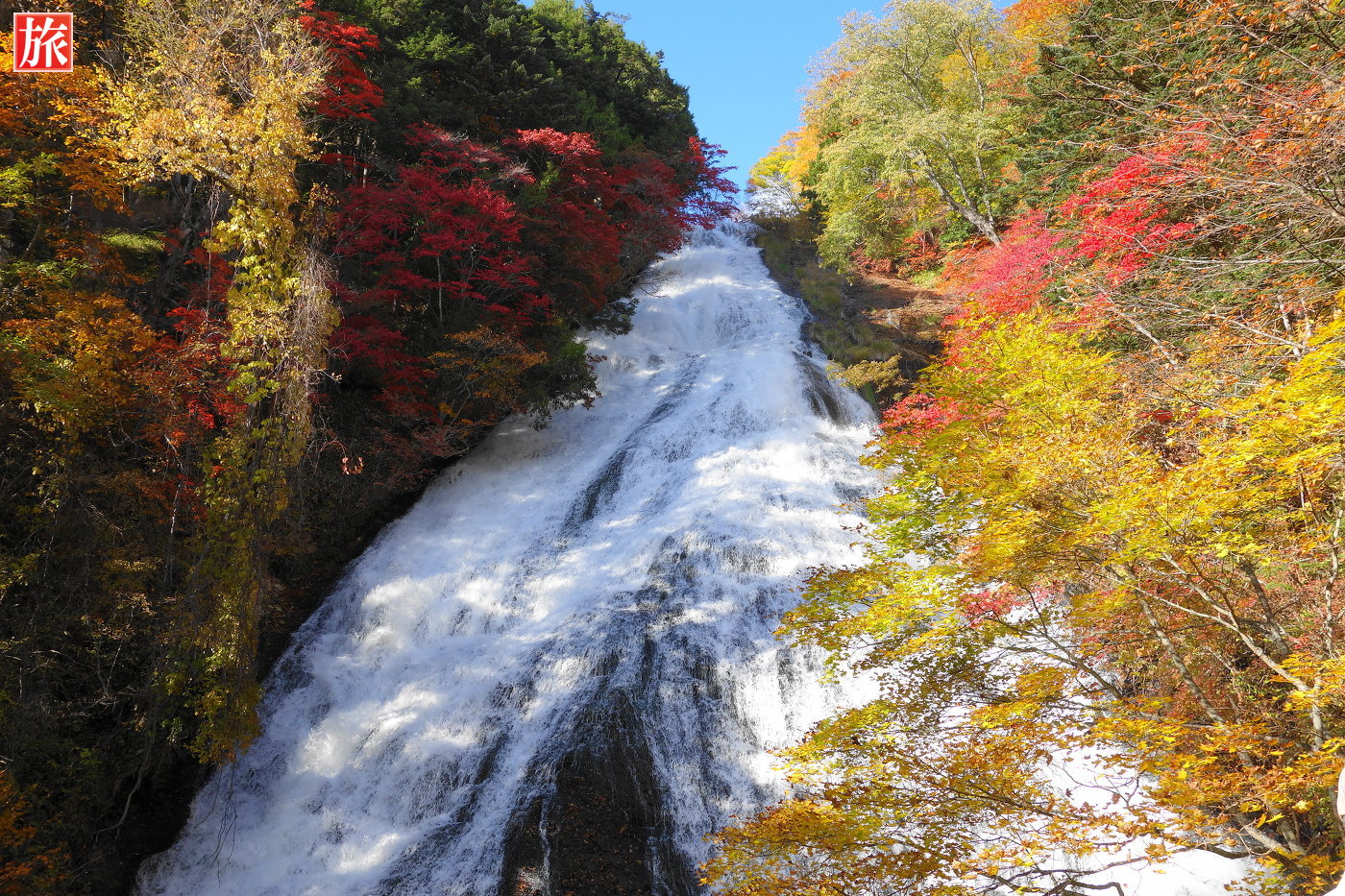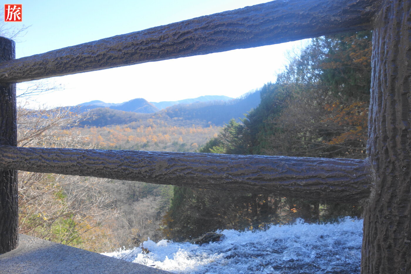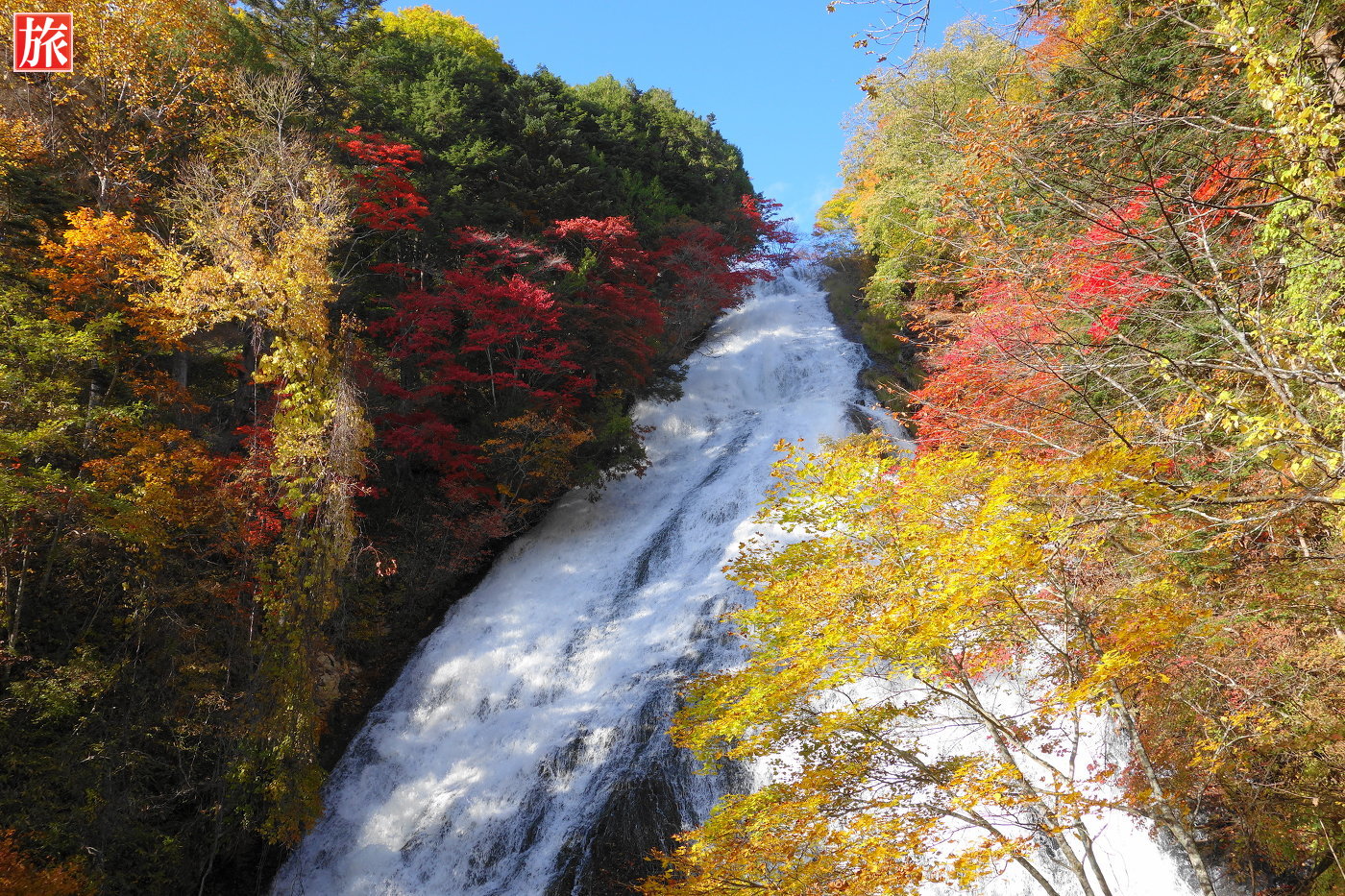 湯ノ湖まで遊歩道が階段で整備され、滝壺・側面・落ち口の三面から滝の姿望めます。