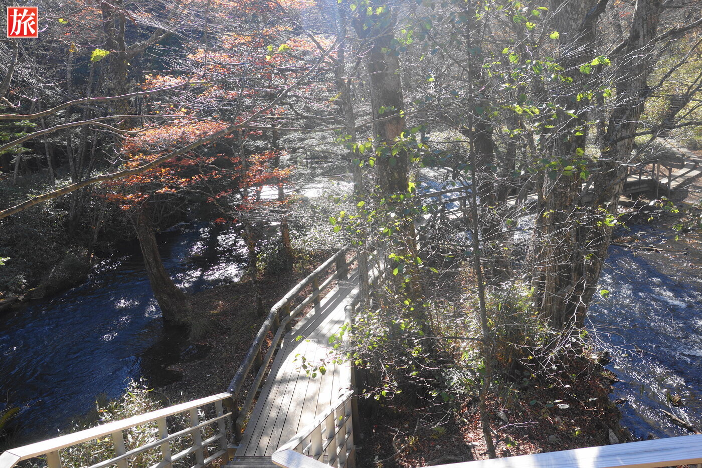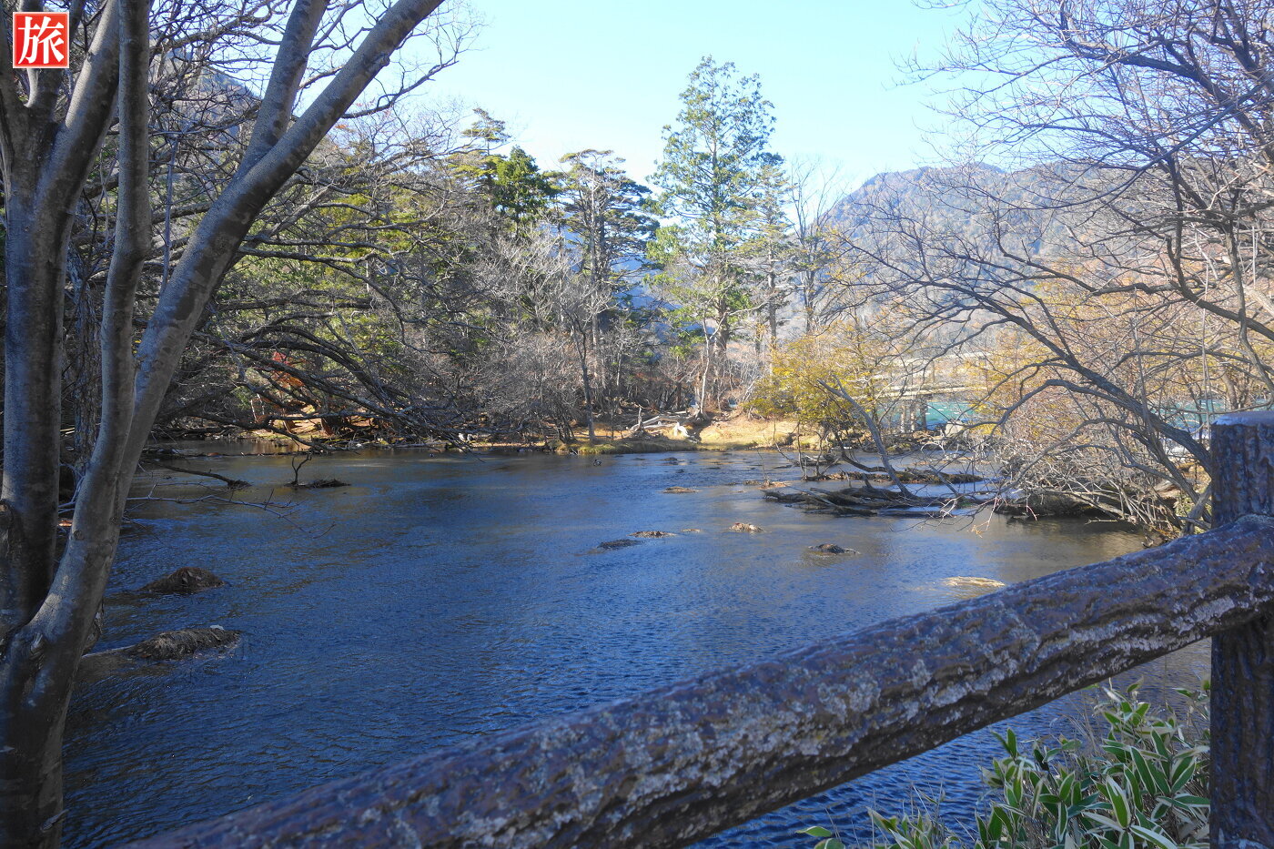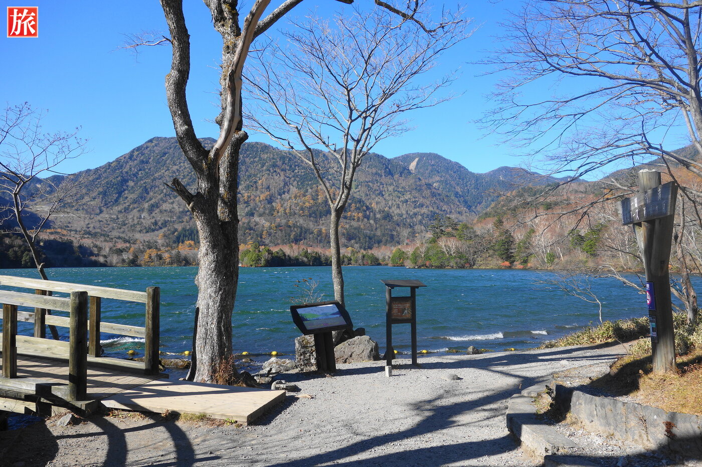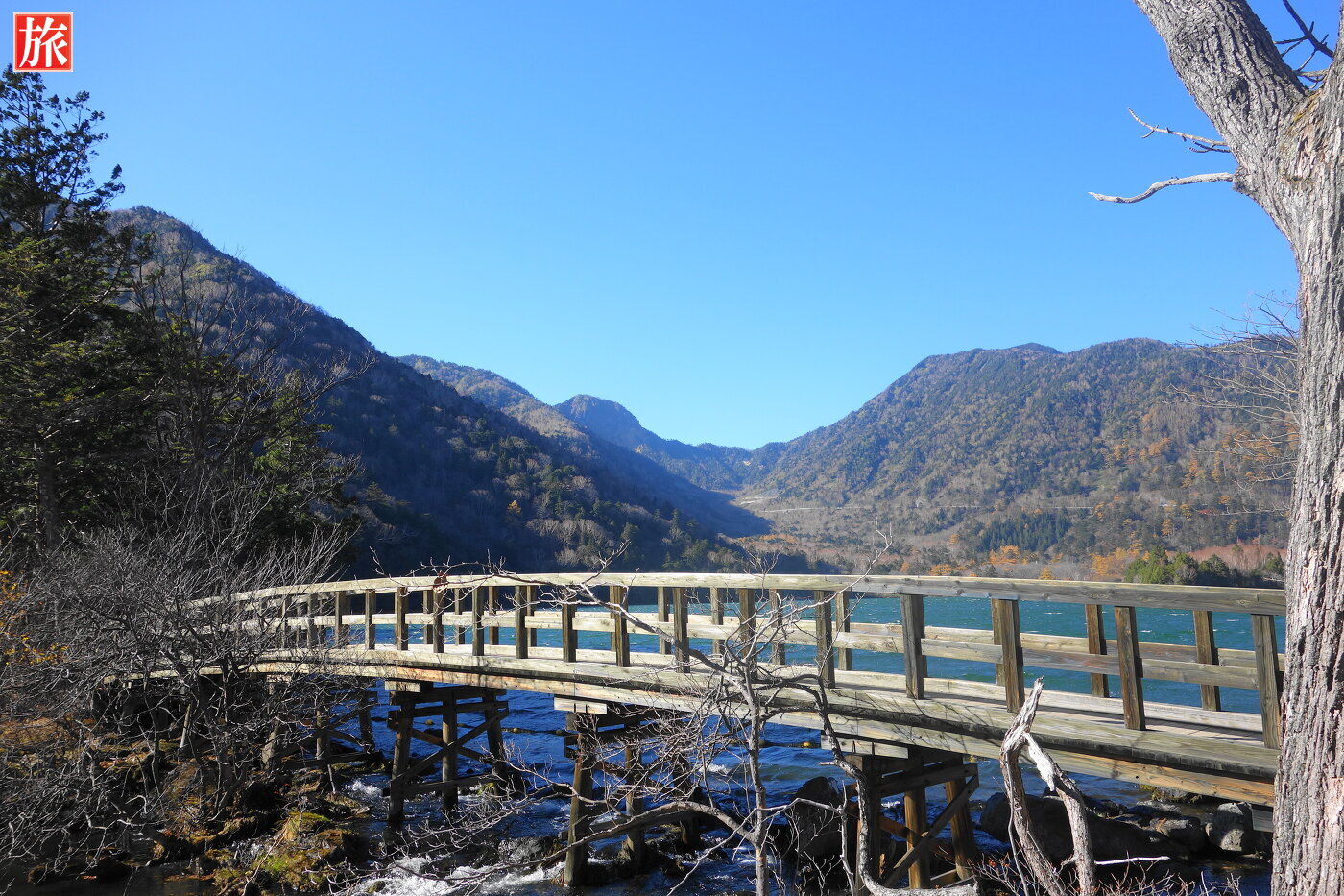 天気は良かったのですが風が強く白波が立っていました。湯ノ湖に架かる橋。この辺り、紅葉は終わっていました。