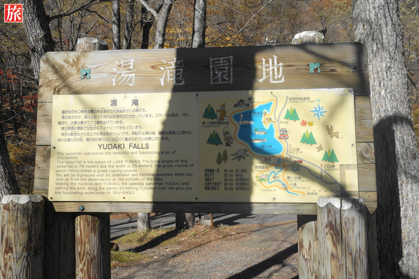 湯滝園地の案内板。周辺は散策出来るよう遊歩道が整備されていました。駐車場から湯滝に向かう途中、左手に売店があります。