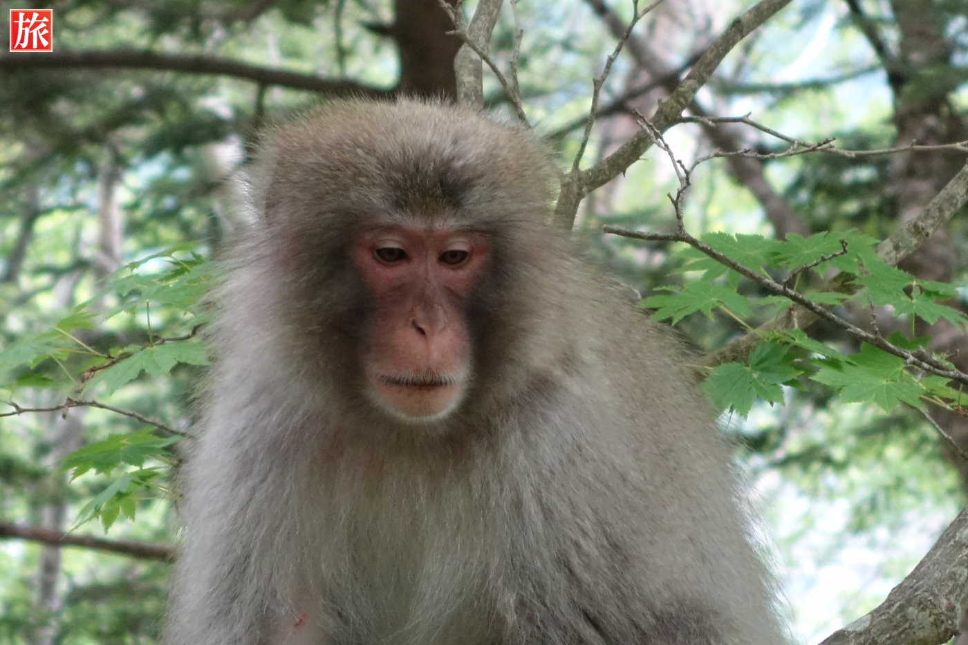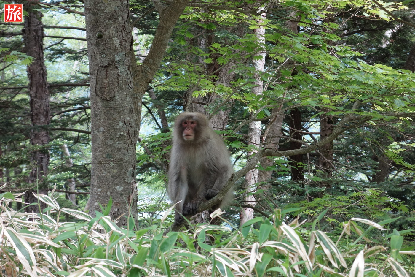 山頂で一休みし下山、来たルートを下る。4合目から3合目の舗装された道で野生の猿に遭遇。