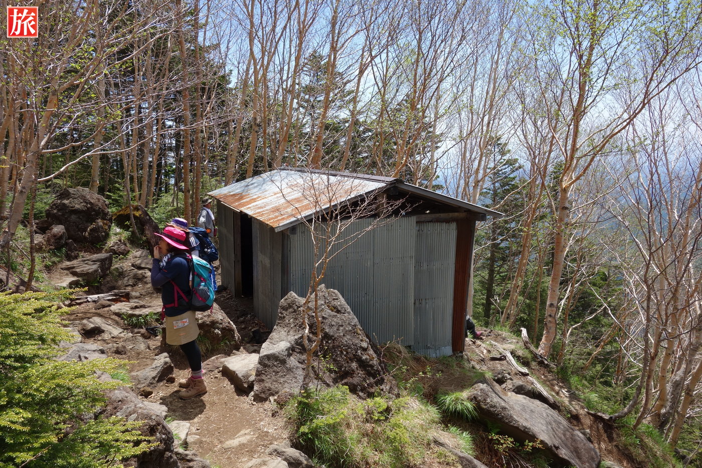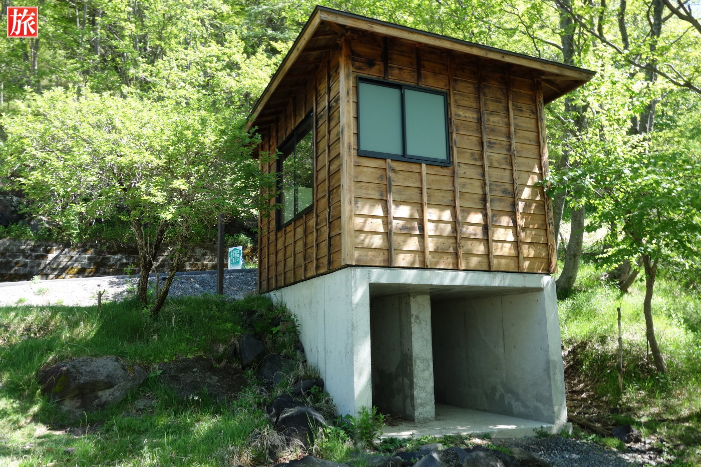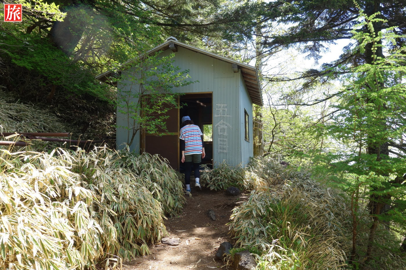 中禅寺湖も見下ろせる高さまで来た。右写真のような非難小屋がほぼ各合目の石像近くに点在している。