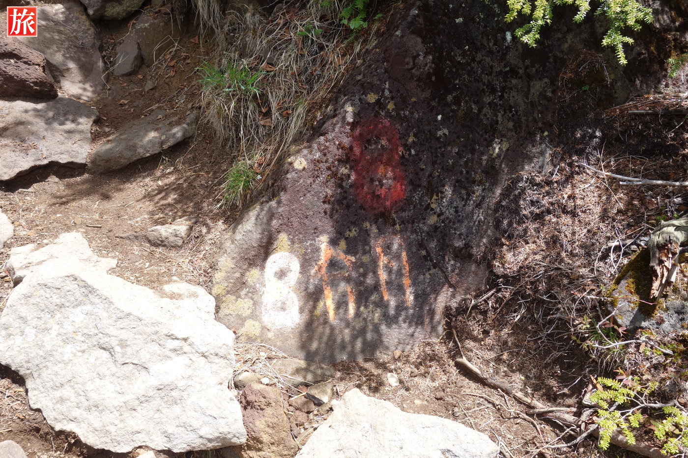 引き続き岩場、いわゆるガレ場を登ると、7.5合目と記されている。