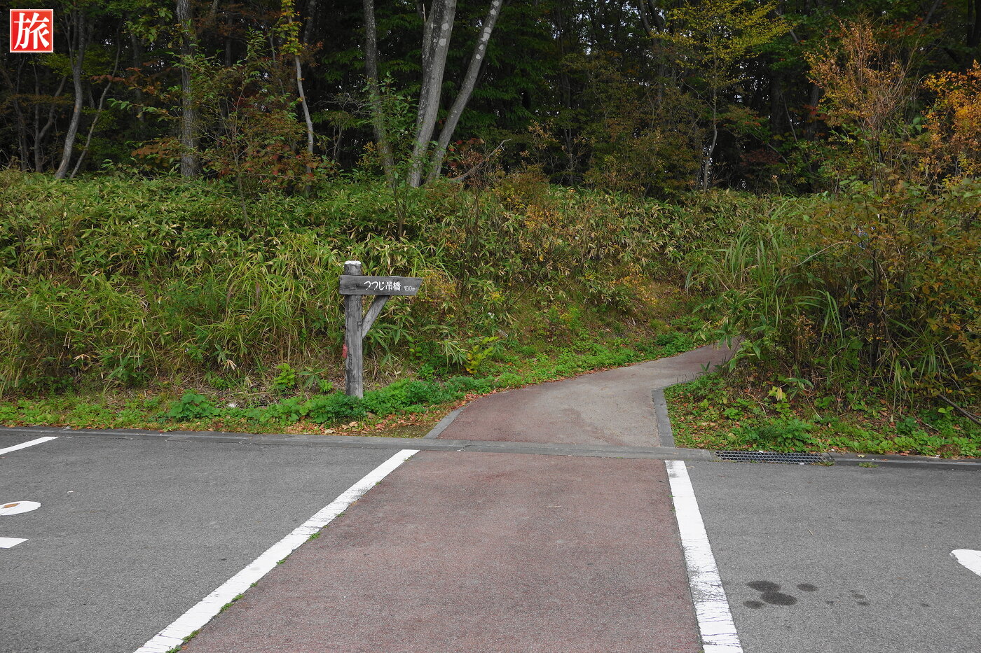 橋手前にあった東屋。つつじ吊橋園地の案内。「つつじつりばし」のプレート。