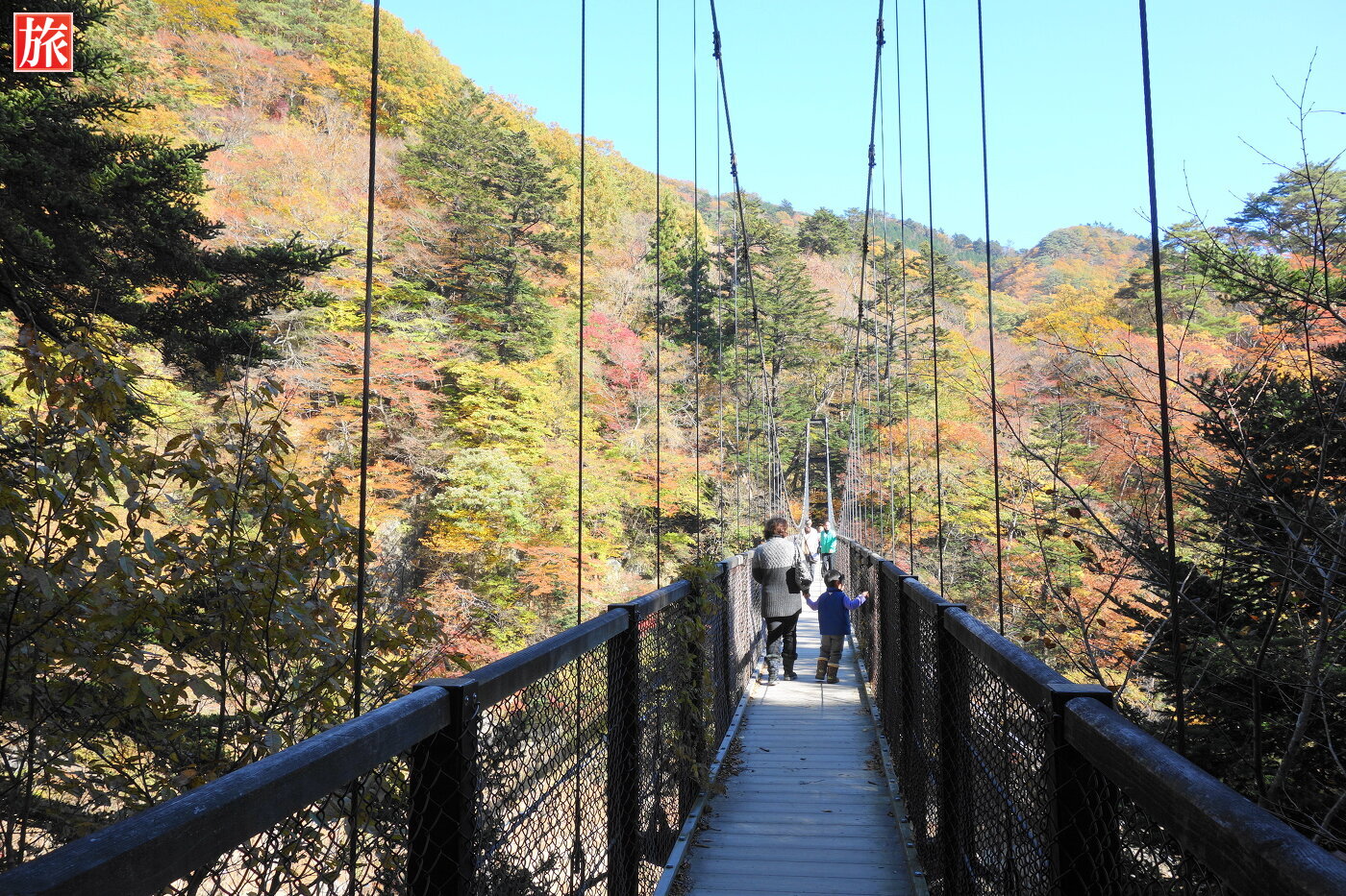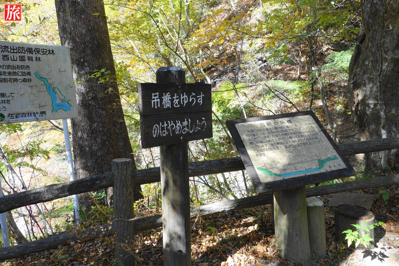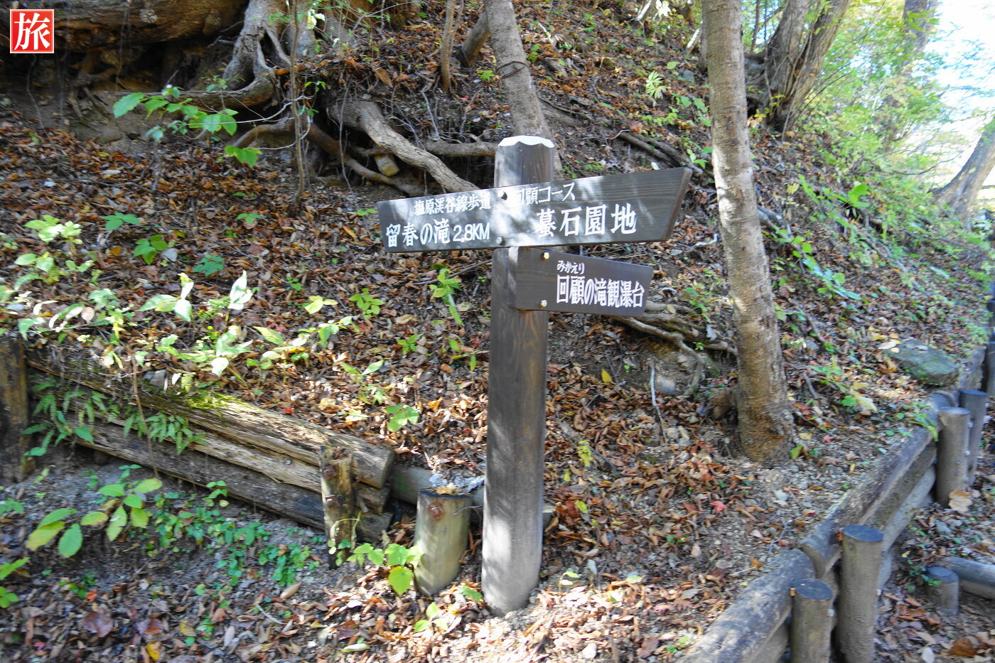 この吊り橋は、なにげに揺れます。渡りきって直ぐ右手方向(10メートル程)に観瀑台があります。景色が美しく、「去る旅人が振り返らずにいられない」と言われたことから、回顧の滝(みかえりのたき)と名が付きいたそうです。
