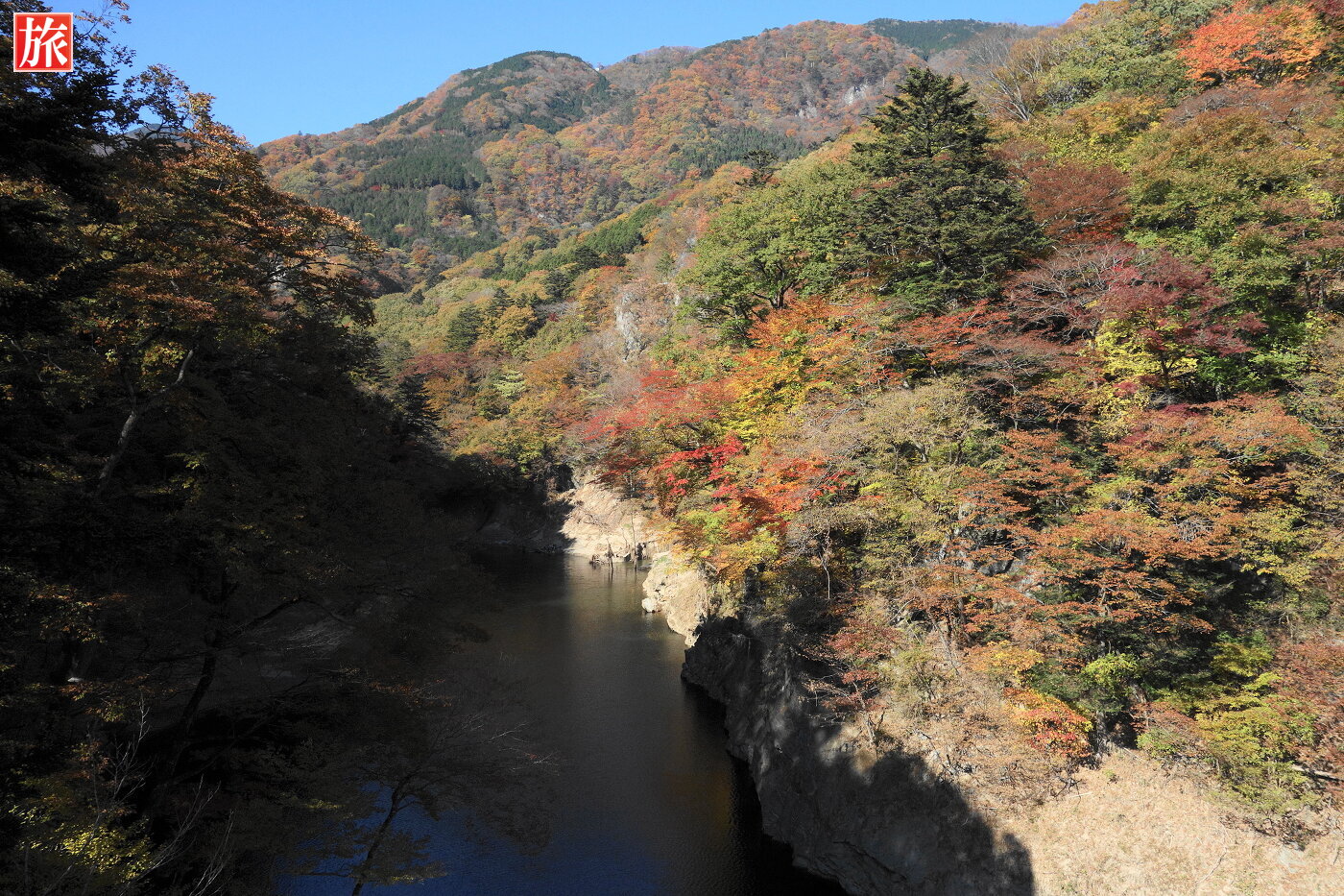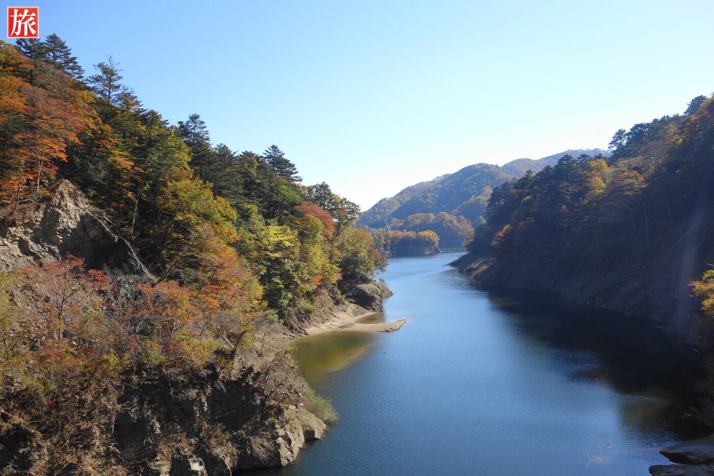 回顧の滝へは回顧の吊橋を渡っていきます。橋の中央付近から上流方向を眺めた様子。下流方向・・・その先には塩原湖があります