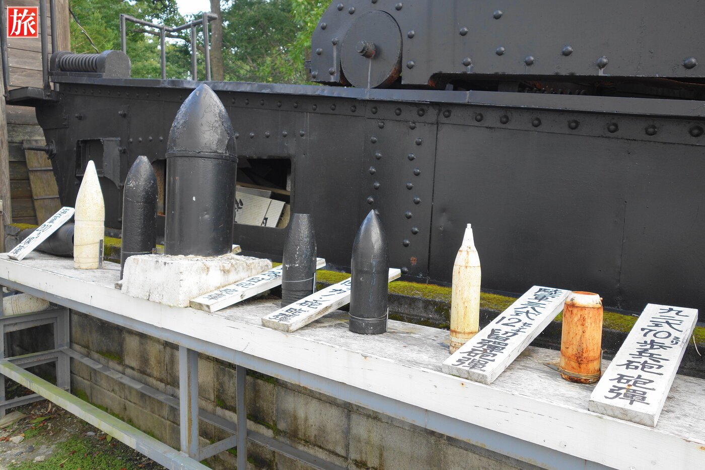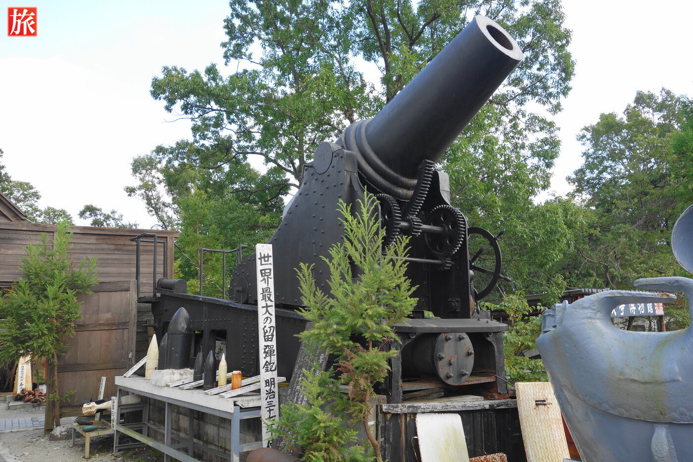 迫力満点!どでかい大砲。要塞砲の説明。いろいろな種類の砲弾。日本最初の戦艦「春日」の錨。