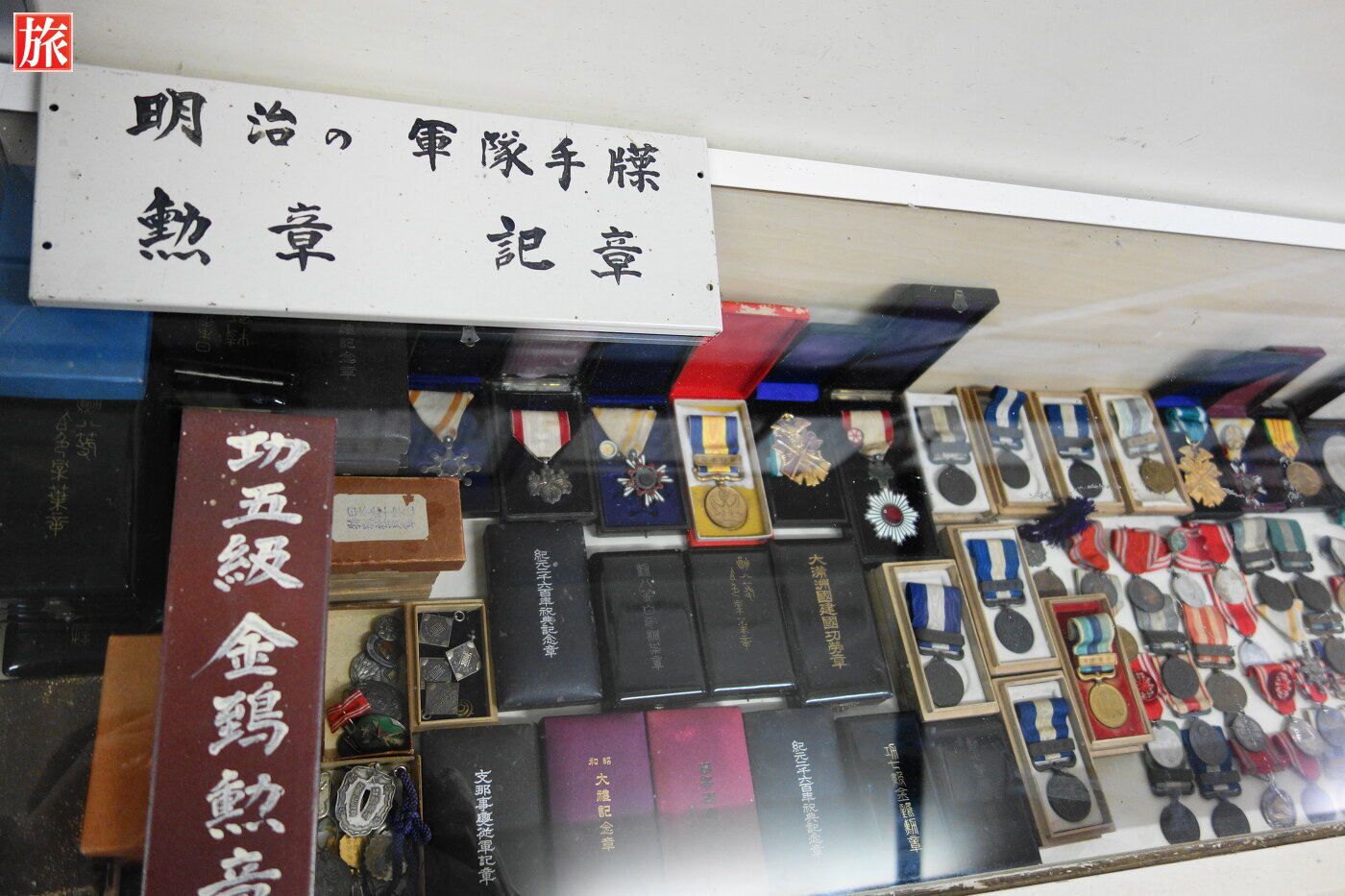 いろいろな日本軍の軍服。珍品コーナー。明治の軍隊手帳・勲章・記章など。