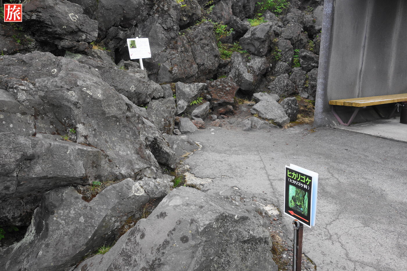 表参道は約510メートルあります。中間辺りにエメラルドグリーンに輝くヒカリゴケが生育していました。回りはゴツゴツした溶岩だらけ・・