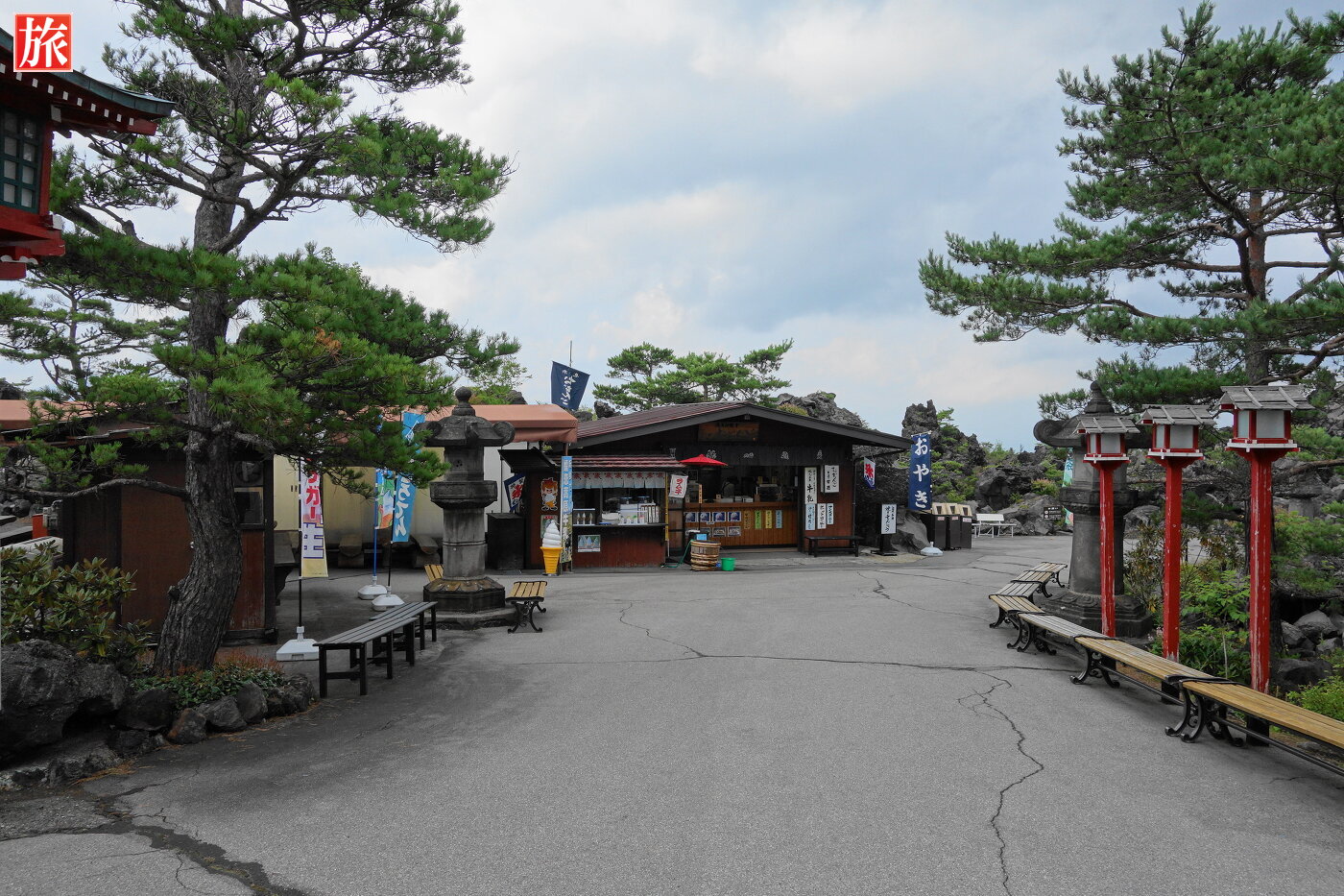 表参道を進み振り返って惣門を見た様子。色々な形をした溶岩・・・休憩所(避難施設)は噴火に備えてガッチリ頭上をガード。