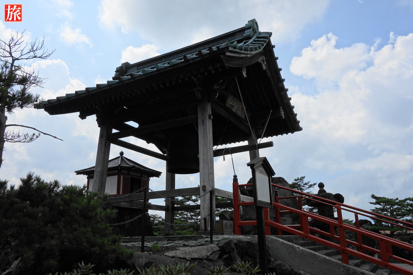 観音堂近くにある「お休み処」。鐘楼堂と浅間山。鐘は自由に撞くことができます。
