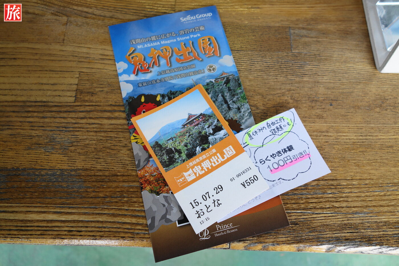 鬼押出し園へは鬼押しハイウェー利用で、軽井沢・草津方面どちらからでも中間の位置にあります。駐車場は無料です。園内遊歩マップ。今回は30分のモデルコース(表参道→観音堂→裏参道→入園口)を廻りました。入園口でチケットを購入!