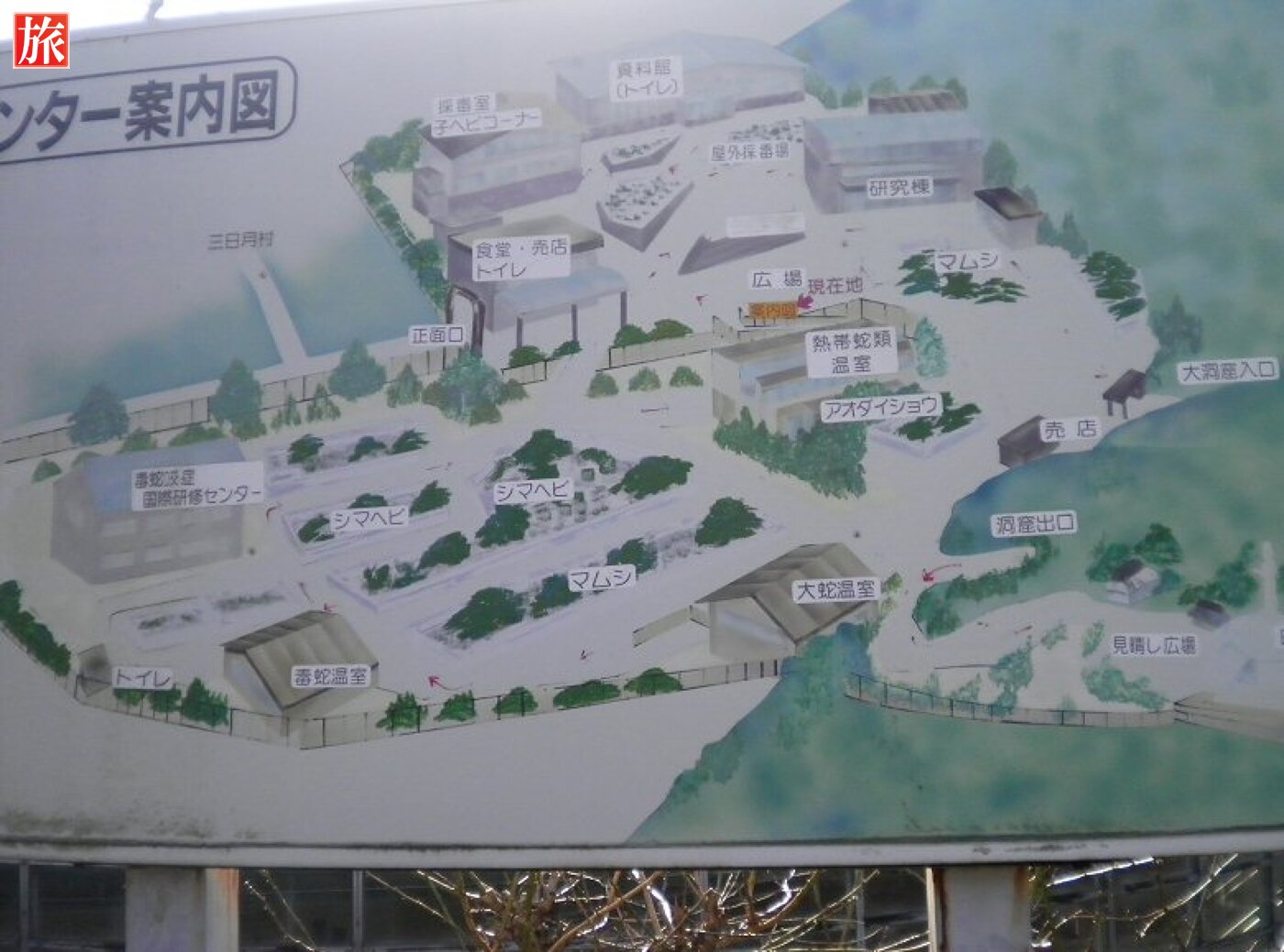 キングコブラなど世界のヘビを飼育した温室、たくさんのシマヘビやマムシなどを放し飼いにした野外放飼場を見学。骨格標本がある資料館や採毒実演を行う採毒室も。