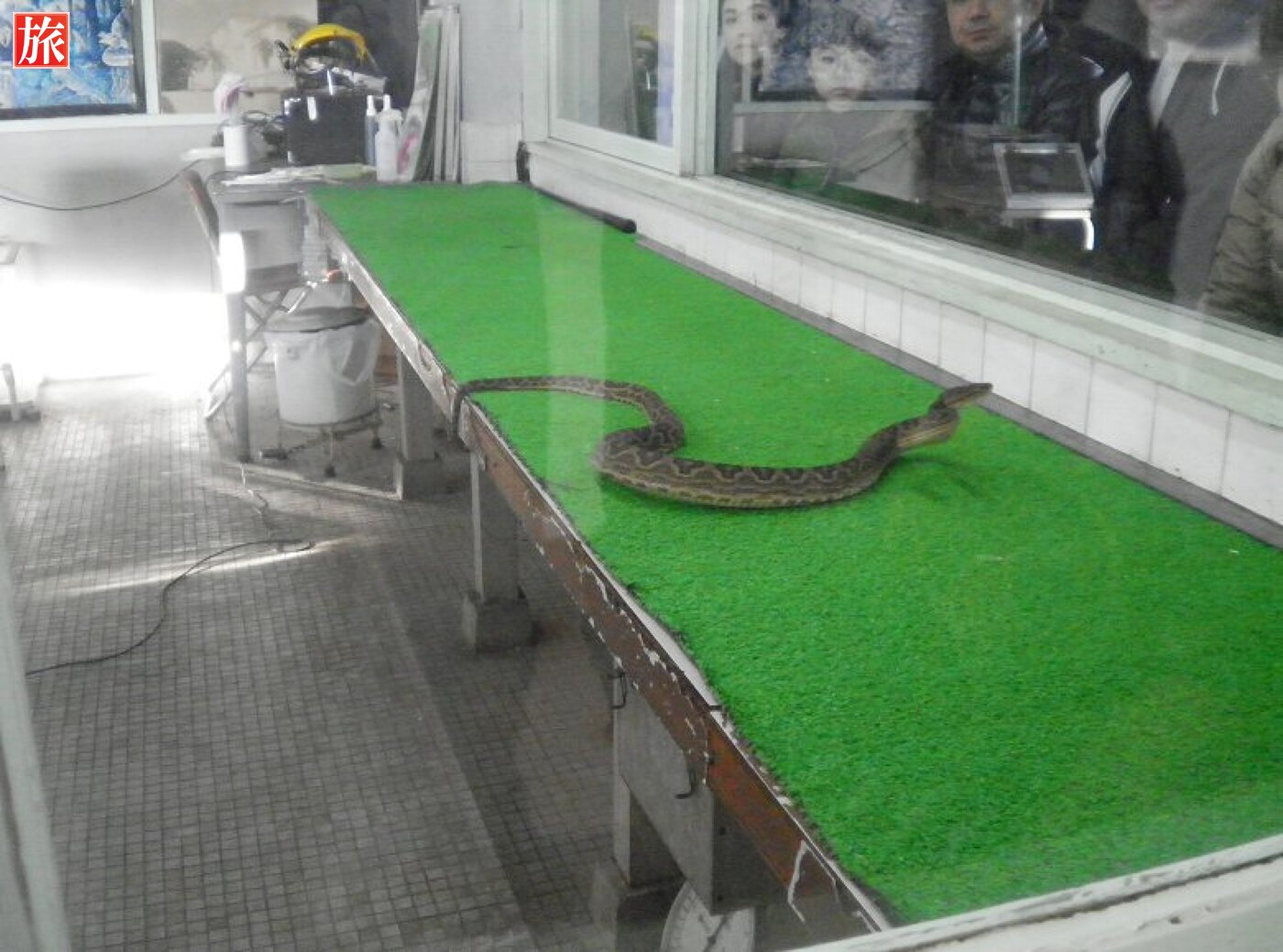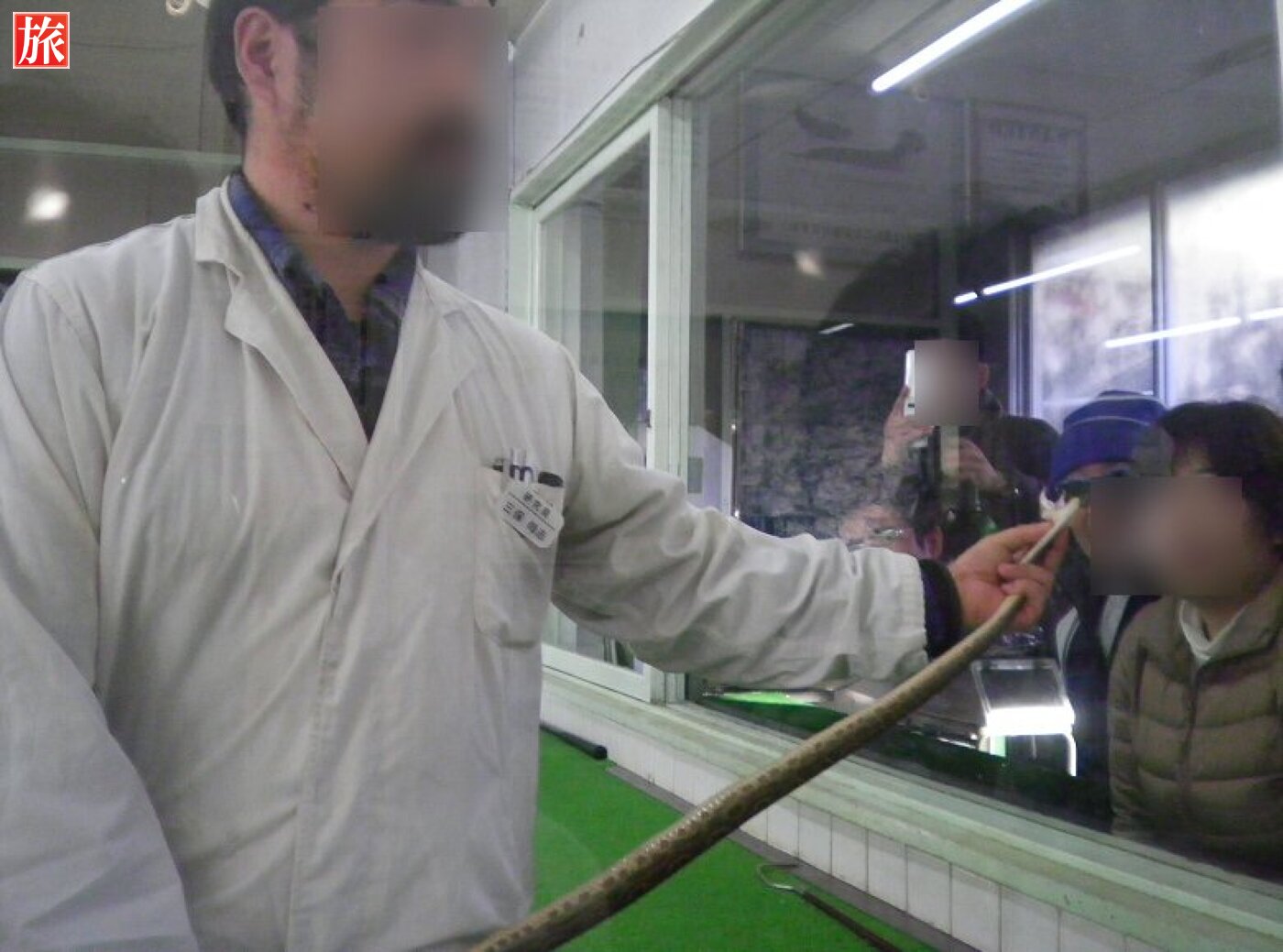 黄色い液体がグラスにしたたり落ちていました。スタッフの方の説明を聞き入ってしまいます、しゃべり上手です。終わりにアオダイショウを触ることが出来ます。