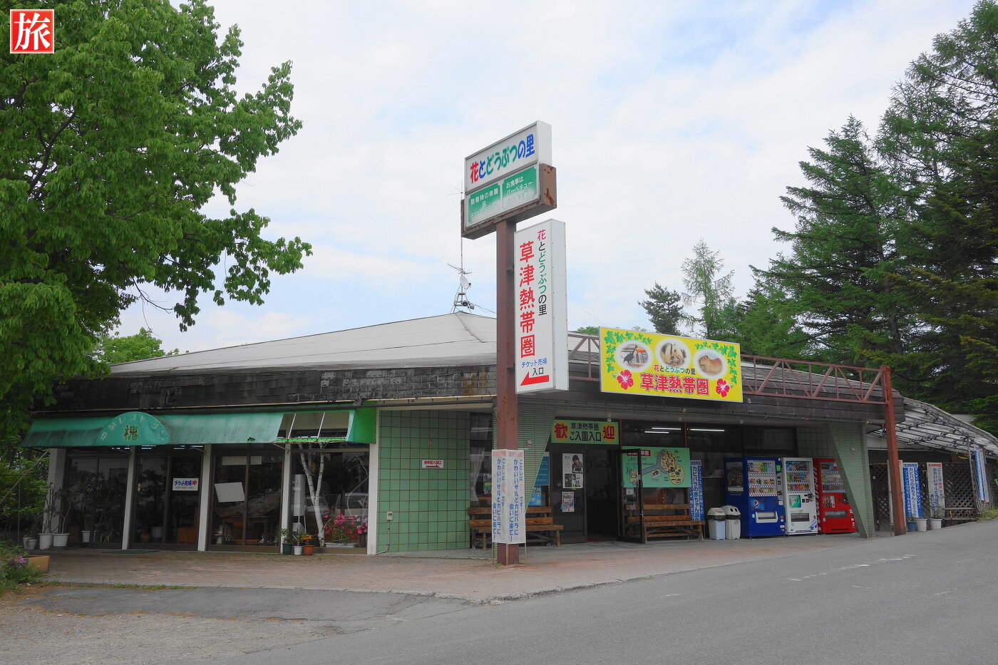 花と動物の里「草津熱帯圏」入口。送迎バスも完備されている。入場チケット、大人一人1000円